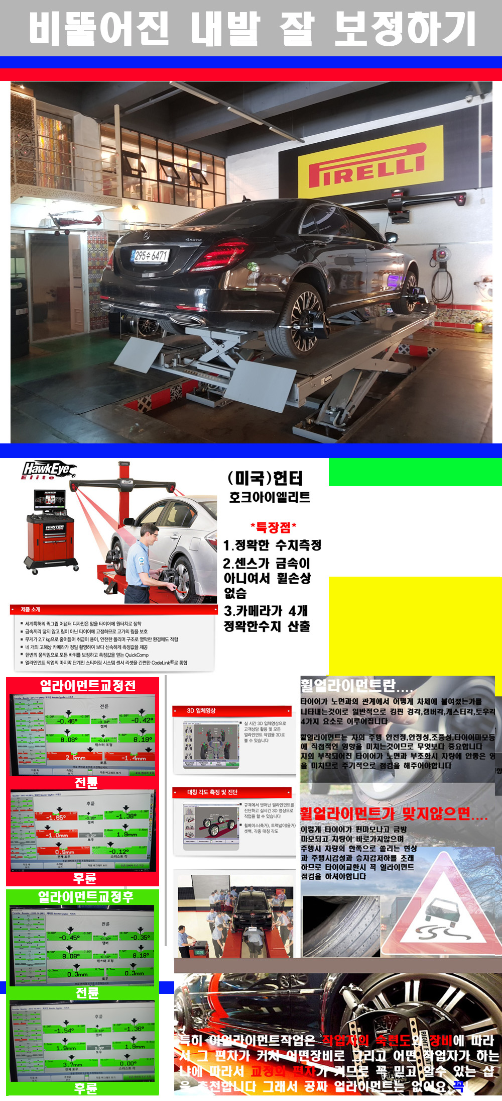 이후 미국 헌터사 호크아이엘리트 장비로 3D얼라이먼트를 진행했습니다 이장비는 현존하는 가장 진화된 얼라이먼트장비입니다 특히 4개의 고성능카메라가 장착되어져 있어 실시간으로 오차가 없는 측정값을 구현하며 바퀴당 각 휠센서 클램프가 프라스틱이며 타이어바닦면을 지지하는 방식이여서 휠의 손상이 없는것이 특징입니다 하지만 장비보다 차량의 얼라이먼트를 볼시 작업자의 정성과 그리고 능력과 숙련도가 관견이기에 꼭 휠얼라이먼트를 장사수단으로 하지않는 샵을 권장합니다 자사는 얼라이먼트정렬시 교정전 교정후를 구분하여 고객님께 직접 이수치값을 확인시켜드리고 작업을 하며 이후 각각의 특성을 가진 타이어들에 대해서 설명 및 관리요령 운전요령 같이 설명해드리고 있습니다 이후 타이어와 휠의 정확한 발란스값과 진동값을 보정후 헌터사 호크아이엘리트 3D얼라이먼트장비로 공장에서 처음 출고될시의 팩토리값으로 교정하였습니다 그리고 타이어질소가스주입기로 3번정도 진공상태로 만든후 질소가스를 주입했습니다 질소가스주입시 가장 관견은 순도이기에 이런 여러번의 진공상태후 주입하고 빼주는 과정를 많이 해주어야합니다 질소가스의 주입시 타이어공기압의 저하가 덜하고 화합물질이 반응을 하지않아 소음전파력과 그리고 타이어안쪽에 수분을 발생하지않으며 타이어안쪽에서의 공기압이 팽창하지않아 타이어에 스트레스를 덜주게 됩니다 하지만 이부분도 공기속에 질소가 80%정도 존재하기에 미미한 차이이지만 질소순도를 높이고 주행시 좋은 점이 확연히 많기에 질소주입을 해드리고 있습니다 특히 고성능타이어나 하중값을 많이 주는 타이어일경우에는 위에서 언급한 부분에서 많이 차이를 보이고 있습니다 이후 타이어왁싱후 출고했습니다+ 감사합니다 |