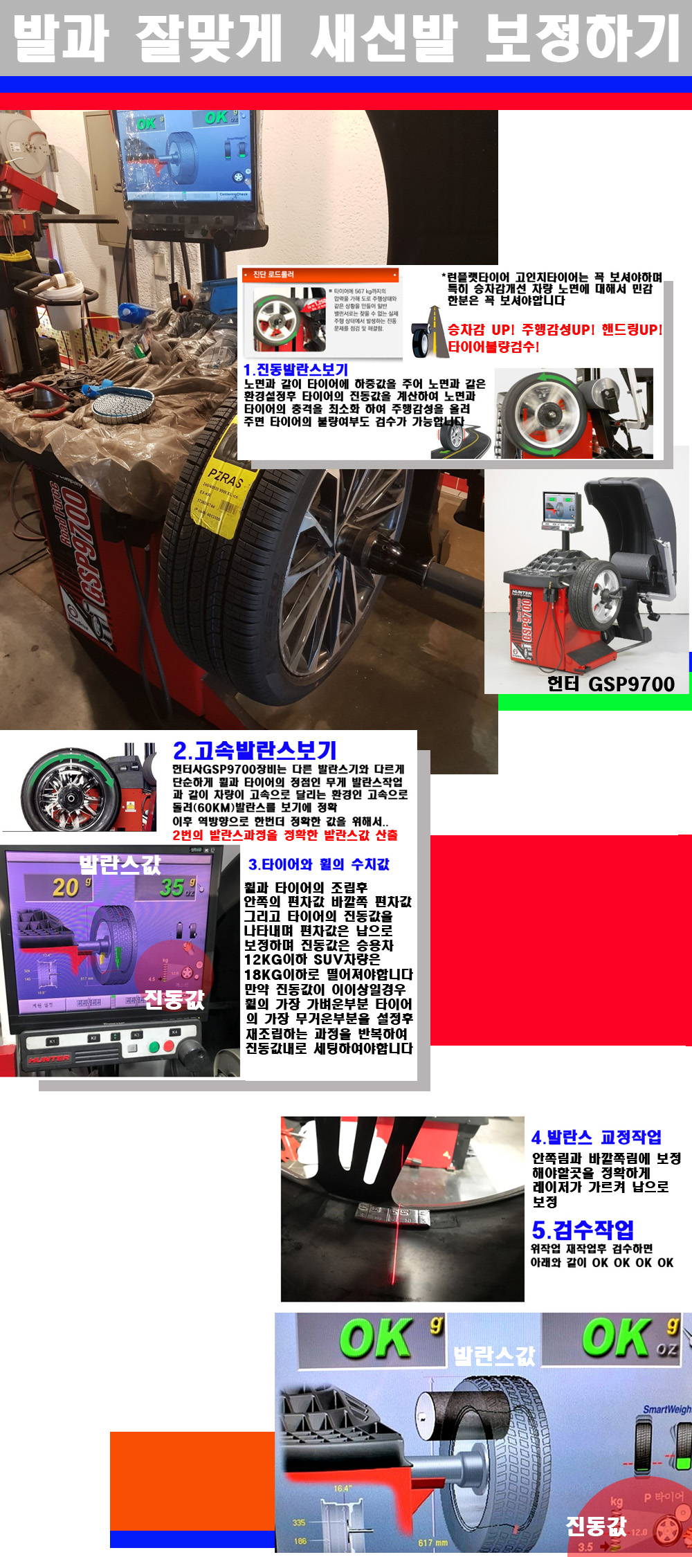 이후 미국 헌터사 GSP9700장비로 고속 및 진동발란스로 더욱더 작업의 정확도와 정밀도를 높였습니다 이장비는 노면에서 올라오는 진동값까지 계산하여 발란스값을 보는 방식으로 진동발란스기는 헌터사GSP9700장비가 유일합니다 이후 역방향으로 60키로의 고속으로 다시 발란스값을 보정하는 방식입니다 그래서 노면에서 올라오는 진동를 잡을수 있으며 특히 타이어의 노면력 측정으로 타이어의 불량여부까지도 검수가 가능한 장비입니다 특히 고속발란스 측정시 타사 발란스기와 틀리게 고속으로 발란스를 보기에 차량이 고속으로 달리는 시뮤레이션 구현이 가능하여 정확한 발란스값을 볼수가 있습니다 그리고 작업자에게는 불필요한 발란스납을 붙이지 않아 미관상으로 좋고 납을 절약하는 고객님에게도윈이고 작업자에게도 윈윈할수 있는 장비입니다 그리고 시중에서 고속진동발란스라고 말하시는 샵들이 많은데 꼭아셔야하는것은 고속발란스는 말그대로 발란스를 볼때 고속으로 돌리기에 60키로 전후 그리고 진동값을 계산하기위해서는 발란스기에 진동롤러가 있어야합니다 그래서 미국헌터사 GSP9700장비가 유일합니다