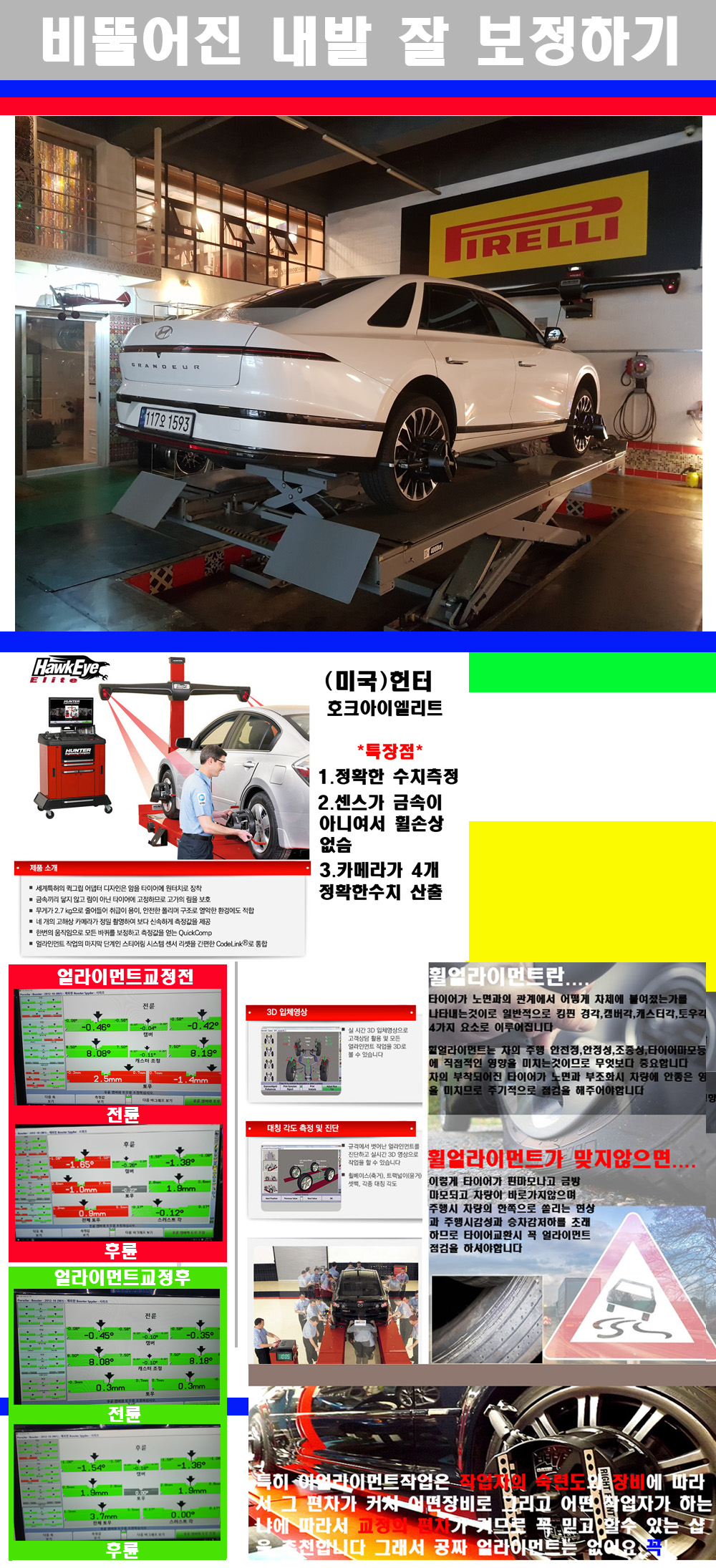 이후 미국 헌터사 호크아이엘리트 장비로 3D얼라이먼트를 진행했습니다 이장비는 현존하는 가장 진화된 얼라이먼트장비입니다 특히 4개의 고성능카메라가 장착되어져 있어 실시간으로 오차가 없는 측정값을 구현하며 바퀴당 각 휠센서 클램프가 프라스틱이며 타이어바닦면을 지지하는 방식이여서 휠의 손상이 없는것이 특징입니다 하지만 장비보다 차량의 얼라이먼트를 볼시 작업자의 정성과 그리고 능력과 숙련도가 관견이기에 꼭 휠얼라이먼트를 장사수단으로 하지않는 샵을 권장합니다 자사는 얼라이먼트정렬시 교정전 교정후를 구분하여 고객님께 직접 이수치값을 확인시켜드리고 작업을 하며 이후 각각의 특성을 가진 타이어들에 대해서 설명 및 관리요령 운전요령 같이 설명해드리고 있습니다 이후 타이어와 휠의 정확한 발란스값과 진동값을 보정후 헌터사 호크아이엘리트 3D얼라이먼트장비로 공장에서 처음 출고될시의 팩토리값으로 교정하였습니다 그리고 타이어질소가스주입기로 3번정도 진공상태로 만든후 질소가스를 주입했습니다 질소가스주입시 가장 관견은 순도이기에 이런 여러번의 진공상태후 주입하고 빼주는 과정를 많이 해주어야합니다 질소가스의 주입시 타이어공기압의 저하가 덜하고 화합물질이 반응을 하지않아 소음전파력과 그리고 타이어안쪽에 수분을 발생하지않으며 타이어안쪽에서의 공기압이 팽창하지않아 타이어에 스트레스를 덜주게 됩니다 하지만 이부분도 공기속에 질소가 80%정도 존재하기에 미미한 차이이지만 질소순도를 높이고 주행시 좋은 점이 확연히 많기에 질소주입을 해드리고 있습니다 특히 고성능타이어나 하중값을 많이 주는 타이어일경우에는 위에서 언급한 부분에서 많이 차이를 보이고 있습니다 이후 타이어왁싱후 출고했습니다+ 감사합니다 |