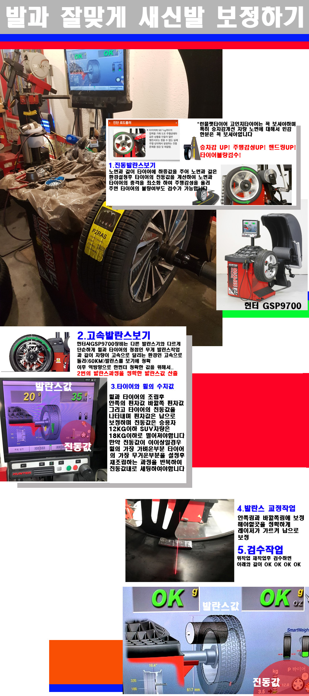 이후 미국 헌터사 GSP9700장비로 고속 및 진동발란스로 더욱더 작업의 정확도와 정밀도를 높였습니다 이장비는 노면에서 올라오는 진동값까지 계산하여 발란스값을 보는 방식으로 진동발란스기는 헌터사GSP9700장비가 유일합니다 이후 역방향으로 60키로의 고속으로 다시 발란스값을 보정하는 방식입니다 그래서 노면에서 올라오는 진동를 잡을수 있으며 특히 타이어의 노면력 측정으로 타이어의 불량여부까지도 검수가 가능한 장비입니다 특히 고속발란스 측정시 타사 발란스기와 틀리게 고속으로 발란스를 보기에 차량이 고속으로 달리는 시뮤레이션 구현이 가능하여 정확한 발란스값을 볼수가 있습니다 그리고 작업자에게는 불필요한 발란스납을 붙이지 않아 미관상으로 좋고 납을 절약하는 고객님에게도윈이고 작업자에게도 윈윈할수 있는 장비입니다 그리고 시중에서 고속진동발란스라고 말하시는 샵들이 많은데 꼭아셔야하는것은 고속발란스는 말그대로 발란스를 볼때 고속으로 돌리기에 60키로 전후 그리고 진동값을 계산하기위해서는 발란스기에 진동롤러가 있어야합니다 그래서 미국헌터사 GSP9700장비가 유일합니다