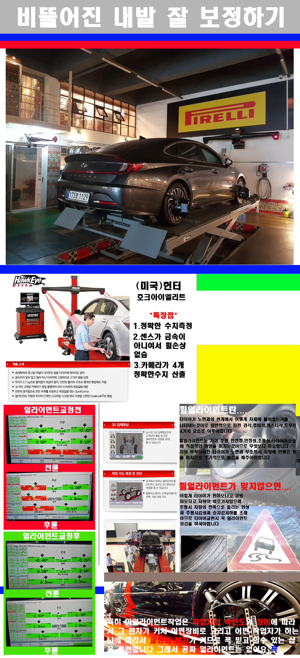 이후 미국 헌터사 호크아이엘리트 장비로 3D얼라이먼트를 진행했습니다 이장비는 현존하는 가장 진화된 얼라이먼트장비입니다 특히 4개의 고성능카메라가 장착되어져 있어 실시간으로 오차가 없는 측정값을 구현하며 바퀴당 각 휠센서 클램프가 프라스틱이며 타이어바닦면을 지지하는 방식이여서 휠의 손상이 없는것이 특징입니다 하지만 장비보다 차량의 얼라이먼트를 볼시 작업자의 정성과 그리고 능력과 숙련도가 관견이기에 꼭 휠얼라이먼트를 장사수단으로 하지않는 샵을 권장합니다 자사는 얼라이먼트정렬시 교정전 교정후를 구분하여 고객님께 직접 이수치값을 확인시켜드리고 작업을 하며 이후 각각의 특성을 가진 타이어들에 대해서 설명 및 관리요령 운전요령 같이 설명해드리고 있습니다 이후 타이어와 휠의 정확한 발란스값과 진동값을 보정후 헌터사 호크아이엘리트 3D얼라이먼트장비로 공장에서 처음 출고될시의 팩토리값으로 교정하였습니다 그리고 타이어질소가스주입기로 3번정도 진공상태로 만든후 질소가스를 주입했습니다 질소가스주입시 가장 관견은 순도이기에 이런 여러번의 진공상태후 주입하고 빼주는 과정를 많이 해주어야합니다 질소가스의 주입시 타이어공기압의 저하가 덜하고 화합물질이 반응을 하지않아 소음전파력과 그리고 타이어안쪽에 수분을 발생하지않으며 타이어안쪽에서의 공기압이 팽창하지않아 타이어에 스트레스를 덜주게 됩니다 하지만 이부분도 공기속에 질소가 80%정도 존재하기에 미미한 차이이지만 질소순도를 높이고 주행시 좋은 점이 확연히 많기에 질소주입을 해드리고 있습니다 특히 고성능타이어나 하중값을 많이 주는 타이어일경우에는 위에서 언급한 부분에서 많이 차이를 보이고 있습니다 이후 타이어왁싱후 출고했습니다+ 감사합니다 |