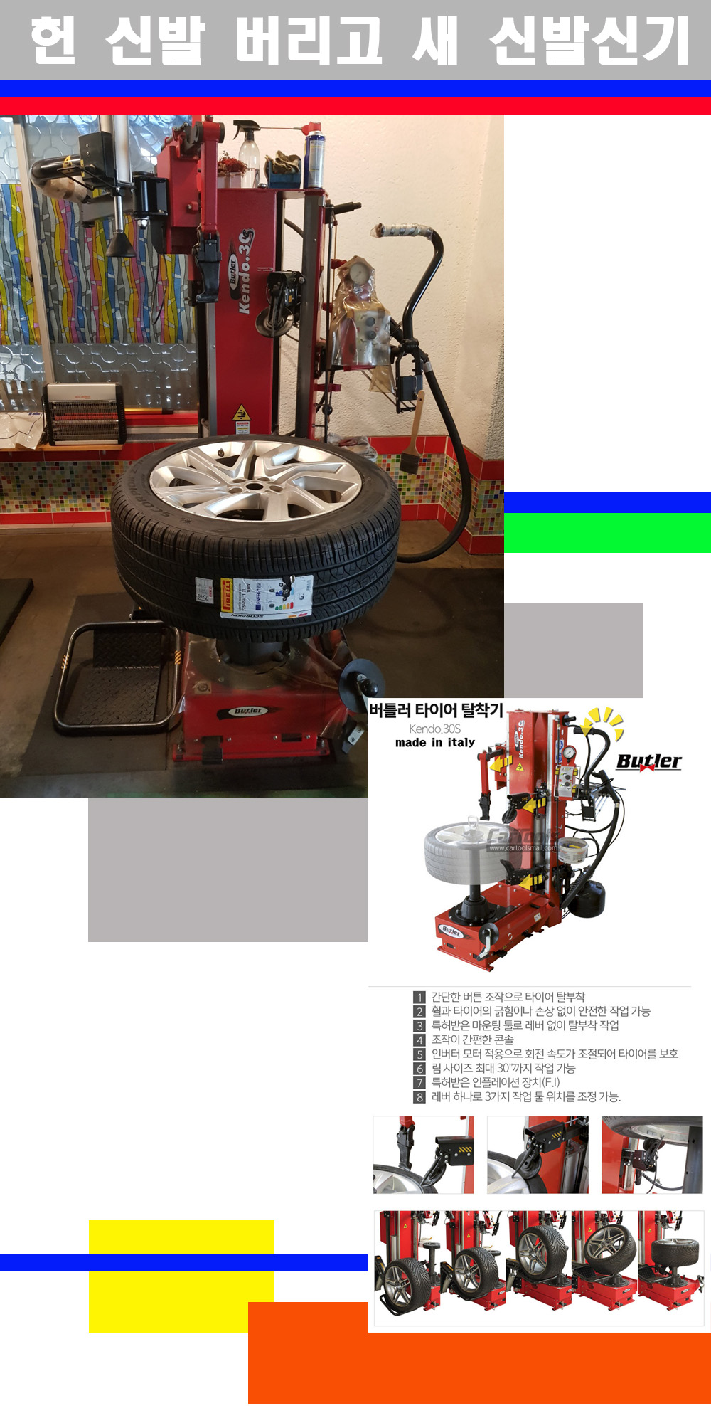 이태리 버틀러사의 켄도3.0S는 휠과 타이어와 조립과 분리시 전혀 제품에 손상을 주지않는 탈착기로 특히 센터락방식(중앙에서 휠를 고정하는 방식)이여서 휠의 중앙부위 잡아서 타이어를 탈부착하고 이후 상하롤러로 타이어를 탈부착합니다 특히 유니포미티작업(휠의 가장가벼운부분과 타이어의 가장 무거운부분을 매칭시키는 작업)시 작업자가 타이어를 정확한 지점에 휠과 매칭시킬수 있는 장점도 있습니다 유니포미티작업 불량시 과도한 진동값으로 핸들링불안 승차감저하 과도한 노면의 충격흡수를 가져와 주행감성을 해치는 첫번째 이유입니다 하지만 이런 작업을 무시하고 그냥 정적인 휠발란스작업만 하는것이 현실입니다 보통 타이어가격만 생각하시고 장착을 하시는데 꼭 이런 부분까지 챙길수 있는 샵을 권장합니다