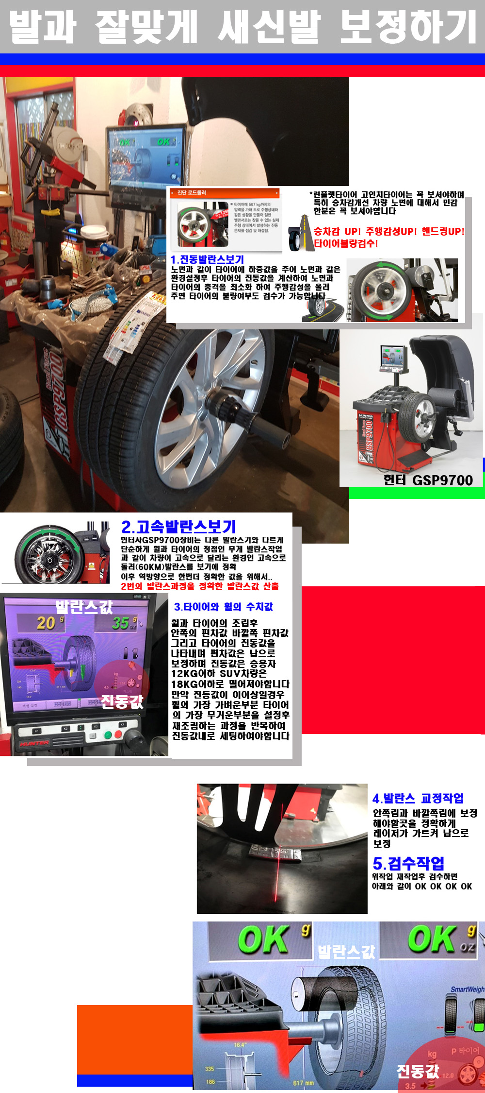 이후 미국 헌터사 GSP9700장비로 고속 및 진동발란스로 더욱더 작업의 정확도와 정밀도를 높였습니다 이장비는 노면에서 올라오는 진동값까지 계산하여 발란스값을 보는 방식으로 진동발란스기는 헌터사GSP9700장비가 유일합니다 이후 역방향으로 60키로의 고속으로 다시 발란스값을 보정하는 방식입니다 그래서 노면에서 올라오는 진동를 잡을수 있으며 특히 타이어의 노면력 측정으로 타이어의 불량여부까지도 검수가 가능한 장비입니다 특히 고속발란스 측정시 타사 발란스기와 틀리게 고속으로 발란스를 보기에 차량이 고속으로 달리는 시뮤레이션 구현이 가능하여 정확한 발란스값을 볼수가 있습니다 그리고 작업자에게는 불필요한 발란스납을 붙이지 않아 미관상으로 좋고 납을 절약하는 고객님에게도윈이고 작업자에게도 윈윈할수 있는 장비입니다 그리고 시중에서 고속진동발란스라고 말하시는 샵들이 많은데 꼭아셔야하는것은 고속발란스는 말그대로 발란스를 볼때 고속으로 돌리기에 60키로 전후 그리고 진동값을 계산하기위해서는 발란스기에 진동롤러가 있어야합니다 그래서 미국헌터사 GSP9700장비가 유일합니다