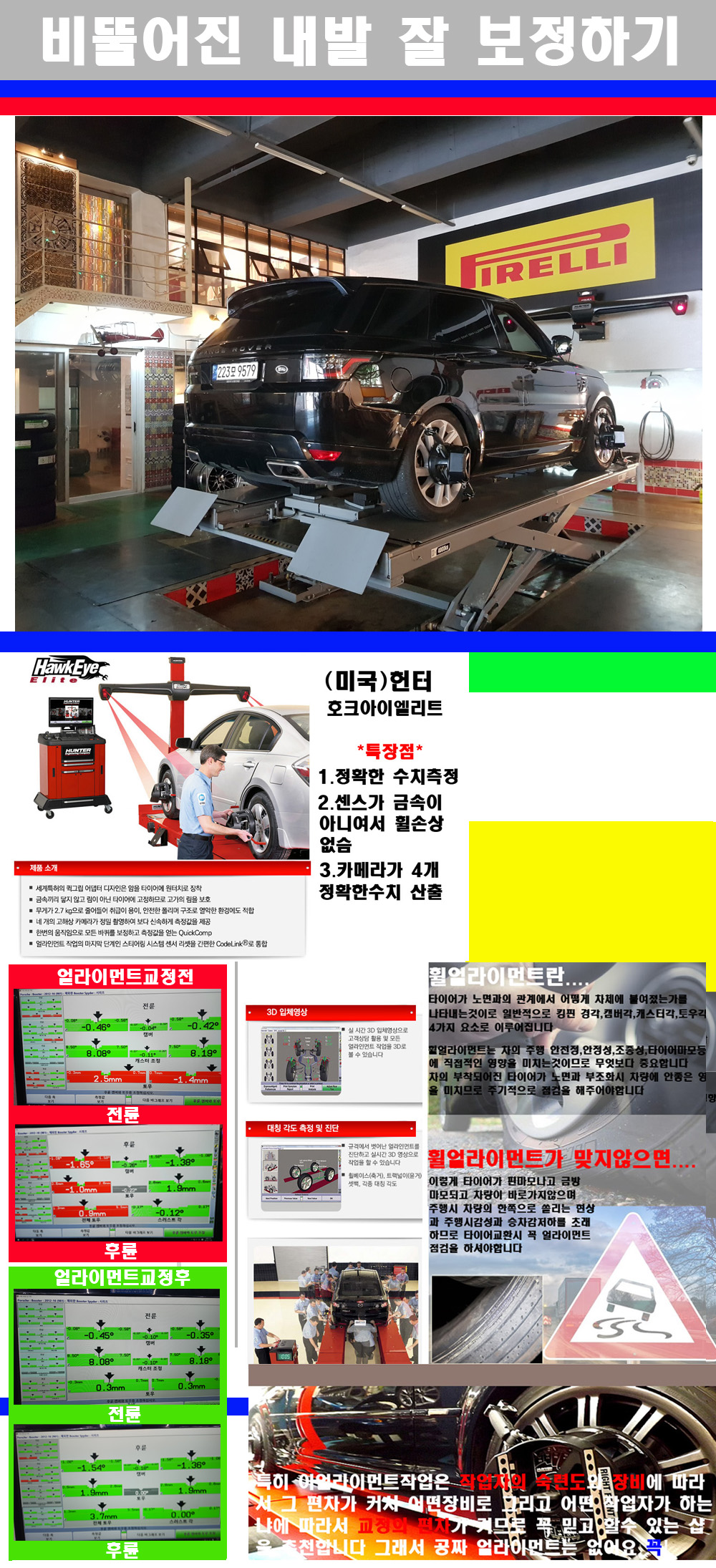 이후 미국 헌터사 호크아이엘리트 장비로 3D얼라이먼트를 진행했습니다 이장비는 현존하는 가장 진화된 얼라이먼트장비입니다 특히 4개의 고성능카메라가 장착되어져 있어 실시간으로 오차가 없는 측정값을 구현하며 바퀴당 각 휠센서 클램프가 프라스틱이며 타이어바닦면을 지지하는 방식이여서 휠의 손상이 없는것이 특징입니다 하지만 장비보다 차량의 얼라이먼트를 볼시 작업자의 정성과 그리고 능력과 숙련도가 관견이기에 꼭 휠얼라이먼트를 장사수단으로 하지않는 샵을 권장합니다 자사는 얼라이먼트정렬시 교정전 교정후를 구분하여 고객님께 직접 이수치값을 확인시켜드리고 작업을 하며 이후 각각의 특성을 가진 타이어들에 대해서 설명 및 관리요령 운전요령 같이 설명해드리고 있습니다 이후 타이어와 휠의 정확한 발란스값과 진동값을 보정후 헌터사 호크아이엘리트 3D얼라이먼트장비로 공장에서 처음 출고될시의 팩토리값으로 교정하였습니다 그리고 타이어질소가스주입기로 3번정도 진공상태로 만든후 질소가스를 주입했습니다 질소가스주입시 가장 관견은 순도이기에 이런 여러번의 진공상태후 주입하고 빼주는 과정를 많이 해주어야합니다 질소가스의 주입시 타이어공기압의 저하가 덜하고 화합물질이 반응을 하지않아 소음전파력과 그리고 타이어안쪽에 수분을 발생하지않으며 타이어안쪽에서의 공기압이 팽창하지않아 타이어에 스트레스를 덜주게 됩니다 하지만 이부분도 공기속에 질소가 80%정도 존재하기에 미미한 차이이지만 질소순도를 높이고 주행시 좋은 점이 확연히 많기에 질소주입을 해드리고 있습니다 특히 고성능타이어나 하중값을 많이 주는 타이어일경우에는 위에서 언급한 부분에서 많이 차이를 보이고 있습니다 이후 타이어왁싱후 출고했습니다+ 감사합니다 |