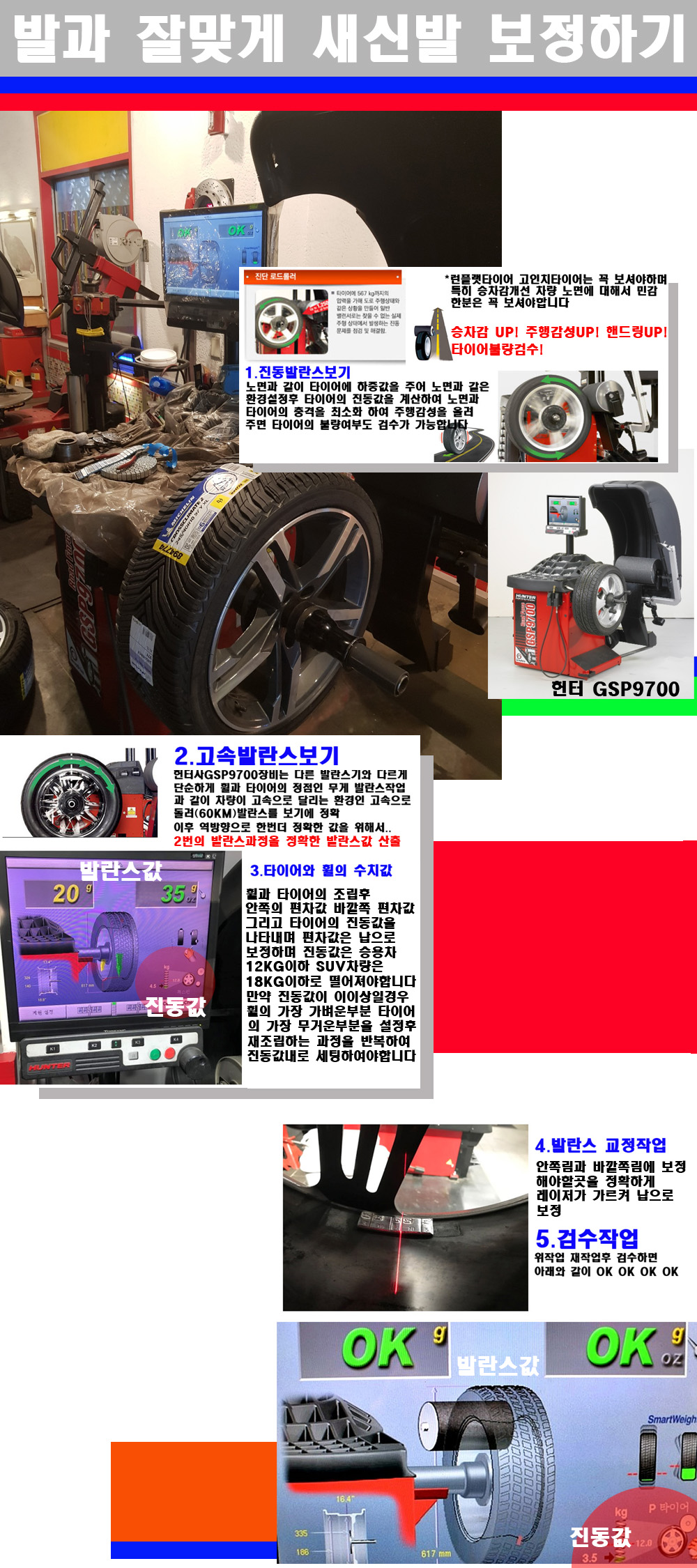 이후 미국 헌터사 GSP9700장비로 고속 및 진동발란스로 더욱더 작업의 정확도와 정밀도를 높였습니다 이장비는 노면에서 올라오는 진동값까지 계산하여 발란스값을 보는 방식으로 진동발란스기는 헌터사GSP9700장비가 유일합니다 이후 역방향으로 60키로의 고속으로 다시 발란스값을 보정하는 방식입니다 그래서 노면에서 올라오는 진동를 잡을수 있으며 특히 타이어의 노면력 측정으로 타이어의 불량여부까지도 검수가 가능한 장비입니다 특히 고속발란스 측정시 타사 발란스기와 틀리게 고속으로 발란스를 보기에 차량이 고속으로 달리는 시뮤레이션 구현이 가능하여 정확한 발란스값을 볼수가 있습니다 그리고 작업자에게는 불필요한 발란스납을 붙이지 않아 미관상으로 좋고 납을 절약하는 고객님에게도윈이고 작업자에게도 윈윈할수 있는 장비입니다 그리고 시중에서 고속진동발란스라고 말하시는 샵들이 많은데 꼭아셔야하는것은 고속발란스는 말그대로 발란스를 볼때 고속으로 돌리기에 60키로 전후 그리고 진동값을 계산하기위해서는 발란스기에 진동롤러가 있어야합니다 그래서 미국헌터사 GSP9700장비가 유일합니다