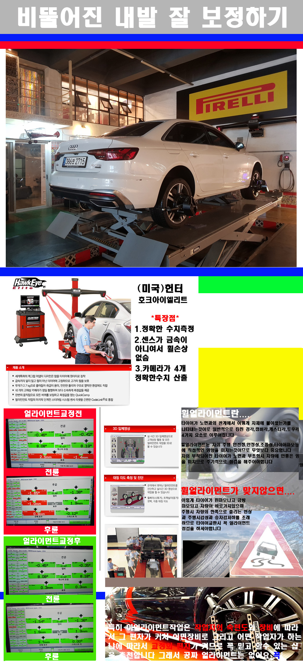 이후 미국 헌터사 호크아이엘리트 장비로 3D얼라이먼트를 진행했습니다 이장비는 현존하는 가장 진화된 얼라이먼트장비입니다 특히 4개의 고성능카메라가 장착되어져 있어 실시간으로 오차가 없는 측정값을 구현하며 바퀴당 각 휠센서 클램프가 프라스틱이며 타이어바닦면을 지지하는 방식이여서 휠의 손상이 없는것이 특징입니다 하지만 장비보다 차량의 얼라이먼트를 볼시 작업자의 정성과 그리고 능력과 숙련도가 관견이기에 꼭 휠얼라이먼트를 장사수단으로 하지않는 샵을 권장합니다 자사는 얼라이먼트정렬시 교정전 교정후를 구분하여 고객님께 직접 이수치값을 확인시켜드리고 작업을 하며 이후 각각의 특성을 가진 타이어들에 대해서 설명 및 관리요령 운전요령 같이 설명해드리고 있습니다 이후 타이어와 휠의 정확한 발란스값과 진동값을 보정후 헌터사 호크아이엘리트 3D얼라이먼트장비로 공장에서 처음 출고될시의 팩토리값으로 교정하였습니다 그리고 타이어질소가스주입기로 3번정도 진공상태로 만든후 질소가스를 주입했습니다 질소가스주입시 가장 관견은 순도이기에 이런 여러번의 진공상태후 주입하고 빼주는 과정를 많이 해주어야합니다 질소가스의 주입시 타이어공기압의 저하가 덜하고 화합물질이 반응을 하지않아 소음전파력과 그리고 타이어안쪽에 수분을 발생하지않으며 타이어안쪽에서의 공기압이 팽창하지않아 타이어에 스트레스를 덜주게 됩니다 하지만 이부분도 공기속에 질소가 80%정도 존재하기에 미미한 차이이지만 질소순도를 높이고 주행시 좋은 점이 확연히 많기에 질소주입을 해드리고 있습니다 특히 고성능타이어나 하중값을 많이 주는 타이어일경우에는 위에서 언급한 부분에서 많이 차이를 보이고 있습니다 이후 타이어왁싱후 출고했습니다+ 감사합니다 |