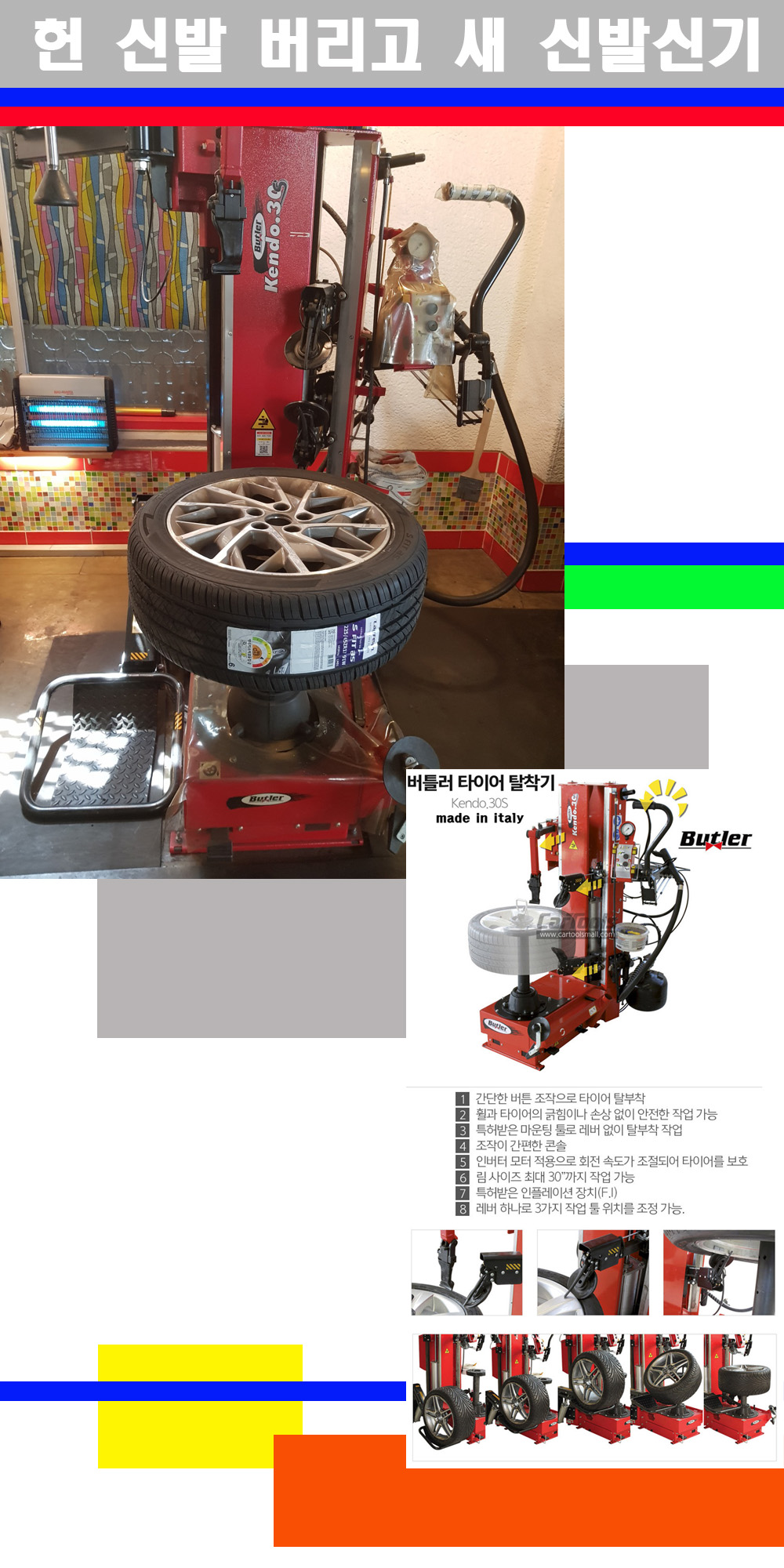 이태리 버틀러사의 켄도3.0S는 휠과 타이어와 조립과 분리시 전혀 제품에 손상을 주지않는 탈착기로 특히 센터락방식(중앙에서 휠를 고정하는 방식)이여서 휠의 중앙부위 잡아서 타이어를 탈부착하고 이후 상하롤러로 타이어를 탈부착합니다 특히 유니포미티작업(휠의 가장가벼운부분과 타이어의 가장 무거운부분을 매칭시키는 작업)시 작업자가 타이어를 정확한 지점에 휠과 매칭시킬수 있는 장점도 있습니다 유니포미티작업 불량시 과도한 진동값으로 핸들링불안 승차감저하 과도한 노면의 충격흡수를 가져와 주행감성을 해치는 첫번째 이유입니다 하지만 이런 작업을 무시하고 그냥 정적인 휠발란스작업만 하는것이 현실입니다 보통 타이어가격만 생각하시고 장착을 하시는데 꼭 이런 부분까지 챙길수 있는 샵을 권장합니다