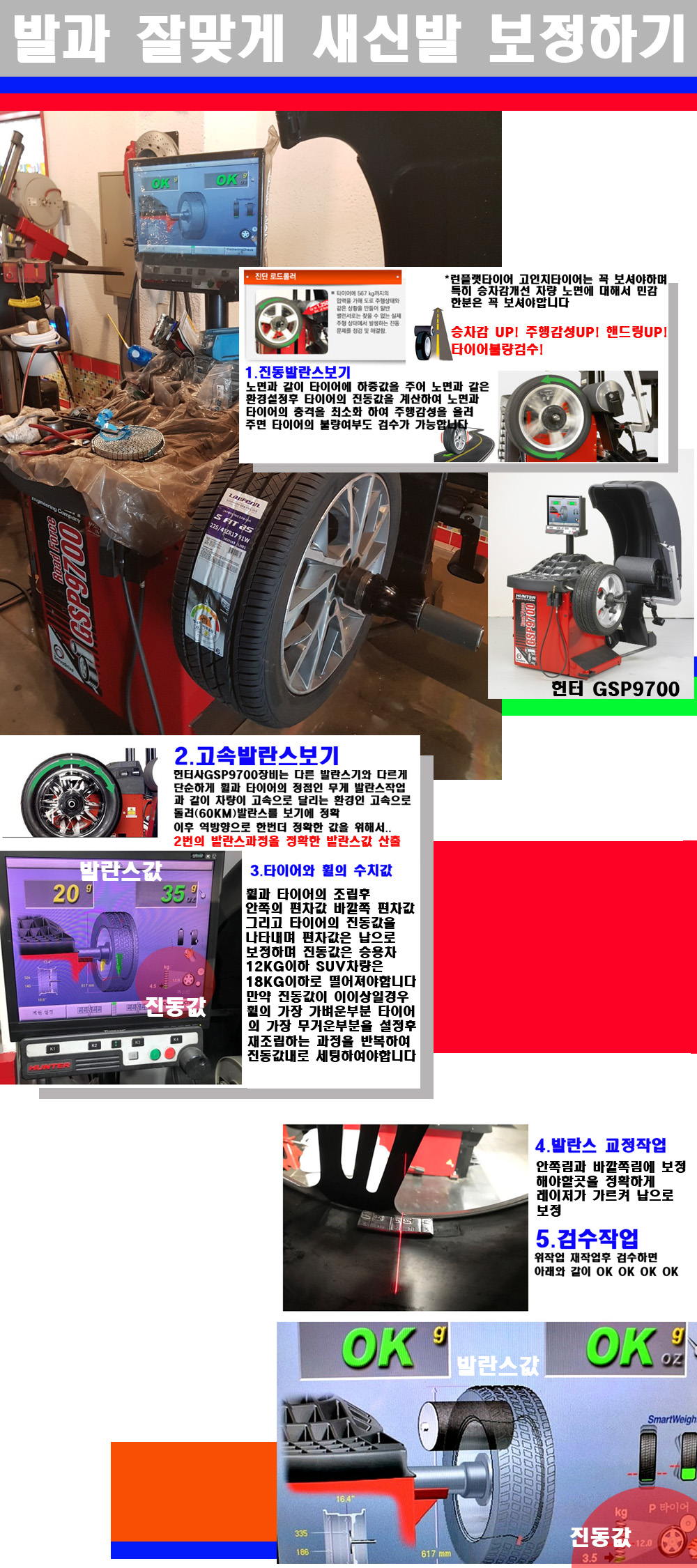 이후 미국 헌터사 GSP9700장비로 고속 및 진동발란스로 더욱더 작업의 정확도와 정밀도를 높였습니다 이장비는 노면에서 올라오는 진동값까지 계산하여 발란스값을 보는 방식으로 진동발란스기는 헌터사GSP9700장비가 유일합니다 이후 역방향으로 60키로의 고속으로 다시 발란스값을 보정하는 방식입니다 그래서 노면에서 올라오는 진동를 잡을수 있으며 특히 타이어의 노면력 측정으로 타이어의 불량여부까지도 검수가 가능한 장비입니다 특히 고속발란스 측정시 타사 발란스기와 틀리게 고속으로 발란스를 보기에 차량이 고속으로 달리는 시뮤레이션 구현이 가능하여 정확한 발란스값을 볼수가 있습니다 그리고 작업자에게는 불필요한 발란스납을 붙이지 않아 미관상으로 좋고 납을 절약하는 고객님에게도윈이고 작업자에게도 윈윈할수 있는 장비입니다 그리고 시중에서 고속진동발란스라고 말하시는 샵들이 많은데 꼭아셔야하는것은 고속발란스는 말그대로 발란스를 볼때 고속으로 돌리기에 60키로 전후 그리고 진동값을 계산하기위해서는 발란스기에 진동롤러가 있어야합니다 그래서 미국헌터사 GSP9700장비가 유일합니다