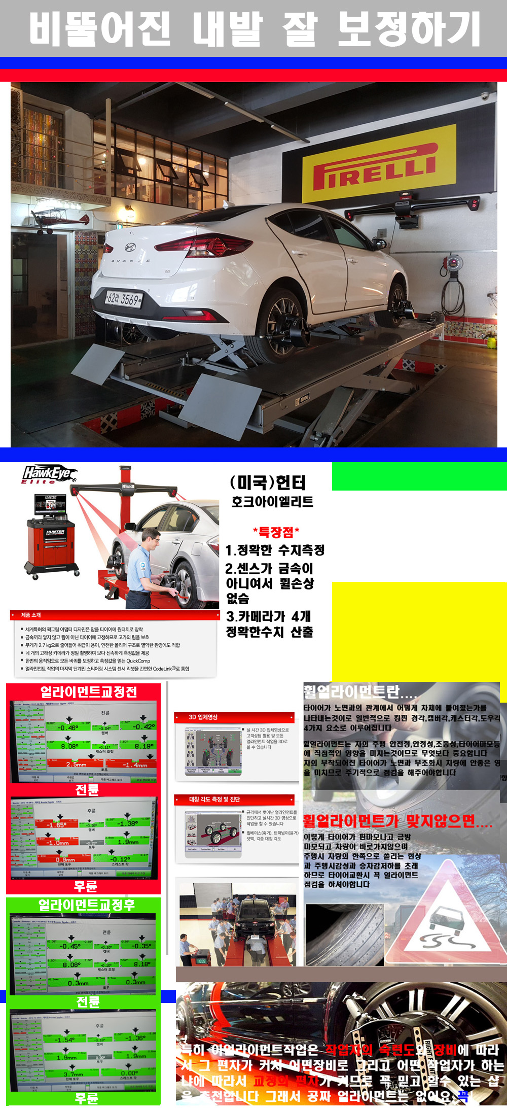 이후 미국 헌터사 호크아이엘리트 장비로 3D얼라이먼트를 진행했습니다 이장비는 현존하는 가장 진화된 얼라이먼트장비입니다 특히 4개의 고성능카메라가 장착되어져 있어 실시간으로 오차가 없는 측정값을 구현하며 바퀴당 각 휠센서 클램프가 프라스틱이며 타이어바닦면을 지지하는 방식이여서 휠의 손상이 없는것이 특징입니다 하지만 장비보다 차량의 얼라이먼트를 볼시 작업자의 정성과 그리고 능력과 숙련도가 관견이기에 꼭 휠얼라이먼트를 장사수단으로 하지않는 샵을 권장합니다 자사는 얼라이먼트정렬시 교정전 교정후를 구분하여 고객님께 직접 이수치값을 확인시켜드리고 작업을 하며 이후 각각의 특성을 가진 타이어들에 대해서 설명 및 관리요령 운전요령 같이 설명해드리고 있습니다 이후 타이어와 휠의 정확한 발란스값과 진동값을 보정후 헌터사 호크아이엘리트 3D얼라이먼트장비로 공장에서 처음 출고될시의 팩토리값으로 교정하였습니다 그리고 타이어질소가스주입기로 3번정도 진공상태로 만든후 질소가스를 주입했습니다 질소가스주입시 가장 관견은 순도이기에 이런 여러번의 진공상태후 주입하고 빼주는 과정를 많이 해주어야합니다 질소가스의 주입시 타이어공기압의 저하가 덜하고 화합물질이 반응을 하지않아 소음전파력과 그리고 타이어안쪽에 수분을 발생하지않으며 타이어안쪽에서의 공기압이 팽창하지않아 타이어에 스트레스를 덜주게 됩니다 하지만 이부분도 공기속에 질소가 80%정도 존재하기에 미미한 차이이지만 질소순도를 높이고 주행시 좋은 점이 확연히 많기에 질소주입을 해드리고 있습니다 특히 고성능타이어나 하중값을 많이 주는 타이어일경우에는 위에서 언급한 부분에서 많이 차이를 보이고 있습니다 이후 타이어왁싱후 출고했습니다+ 감사합니다 |