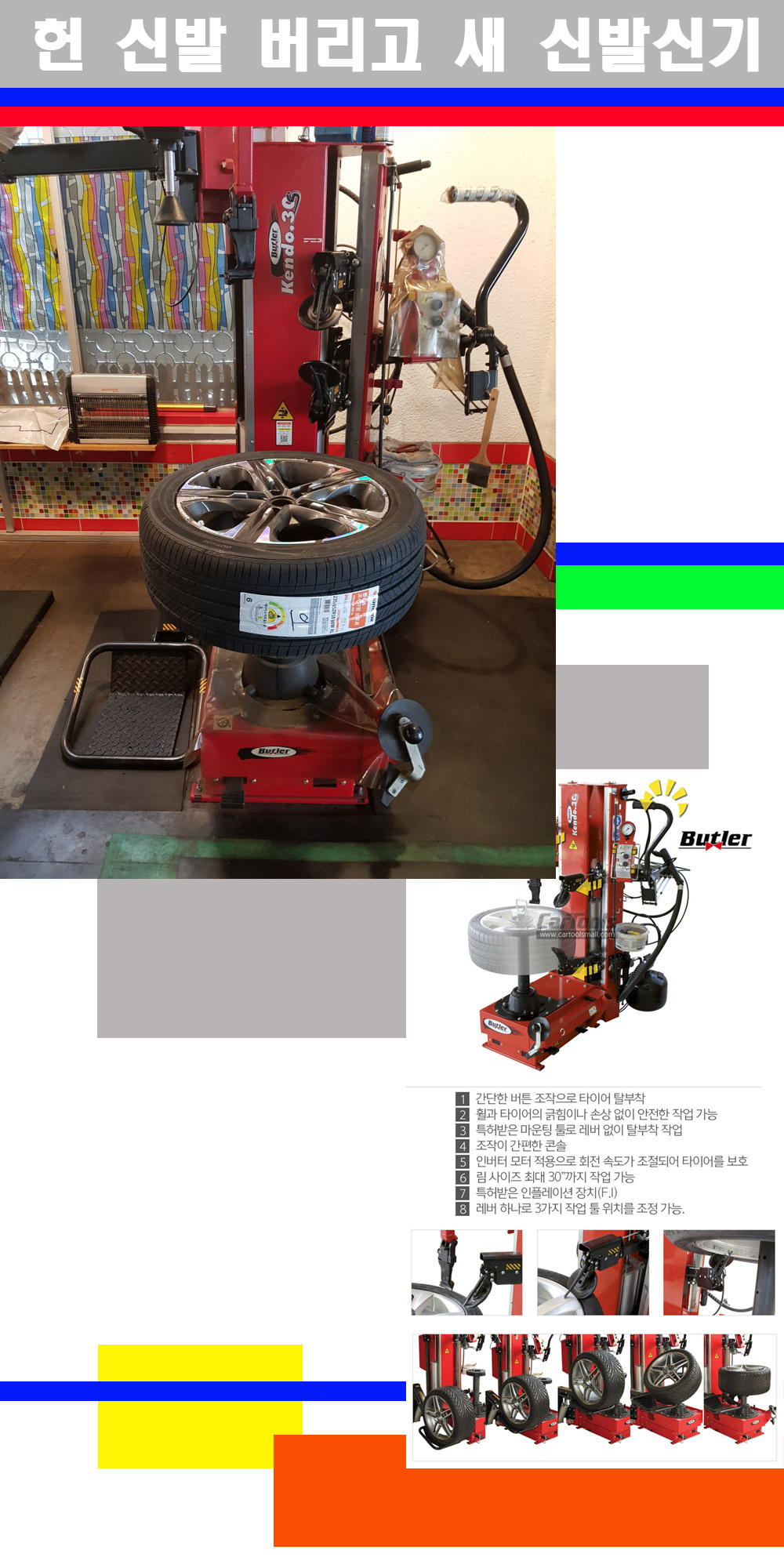 이태리 버틀러사의 켄도3.0S는 휠과 타이어와 조립과 분리시 전혀 제품에 손상을 주지않는 탈착기로 특히 센터락방식(중앙에서 휠를 고정하는 방식)이여서 휠의 중앙부위 잡아서 타이어를 탈부착하고 이후 상하롤러로 타이어를 탈부착합니다 특히 유니포미티작업(휠의 가장가벼운부분과 타이어의 가장 무거운부분을 매칭시키는 작업)시 작업자가 타이어를 정확한 지점에 휠과 매칭시킬수 있는 장점도 있습니다 유니포미티작업 불량시 과도한 진동값으로 핸들링불안 승차감저하 과도한 노면의 충격흡수를 가져와 주행감성을 해치는 첫번째 이유입니다 하지만 이런 작업을 무시하고 그냥 정적인 휠발란스작업만 하는것이 현실입니다 보통 타이어가격만 생각하시고 장착을 하시는데 꼭 이런 부분까지 챙길수 있는 샵을 권장합니다