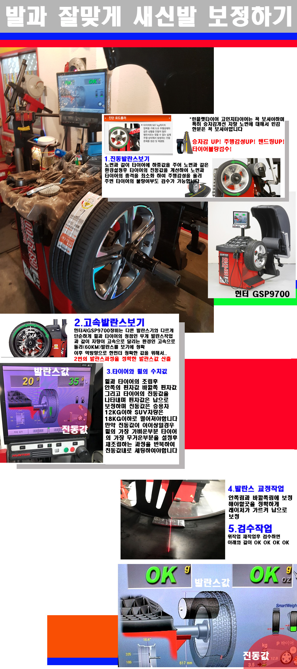 이후 미국 헌터사 GSP9700장비로 고속 및 진동발란스로 더욱더 작업의 정확도와 정밀도를 높였습니다 이장비는 노면에서 올라오는 진동값까지 계산하여 발란스값을 보는 방식으로 진동발란스기는 헌터사GSP9700장비가 유일합니다 이후 역방향으로 60키로의 고속으로 다시 발란스값을 보정하는 방식입니다 그래서 노면에서 올라오는 진동를 잡을수 있으며 특히 타이어의 노면력 측정으로 타이어의 불량여부까지도 검수가 가능한 장비입니다 특히 고속발란스 측정시 타사 발란스기와 틀리게 고속으로 발란스를 보기에 차량이 고속으로 달리는 시뮤레이션 구현이 가능하여 정확한 발란스값을 볼수가 있습니다 그리고 작업자에게는 불필요한 발란스납을 붙이지 않아 미관상으로 좋고 납을 절약하는 고객님에게도윈이고 작업자에게도 윈윈할수 있는 장비입니다 그리고 시중에서 고속진동발란스라고 말하시는 샵들이 많은데 꼭아셔야하는것은 고속발란스는 말그대로 발란스를 볼때 고속으로 돌리기에 60키로 전후 그리고 진동값을 계산하기위해서는 발란스기에 진동롤러가 있어야합니다 그래서 미국헌터사 GSP9700장비가 유일합니다