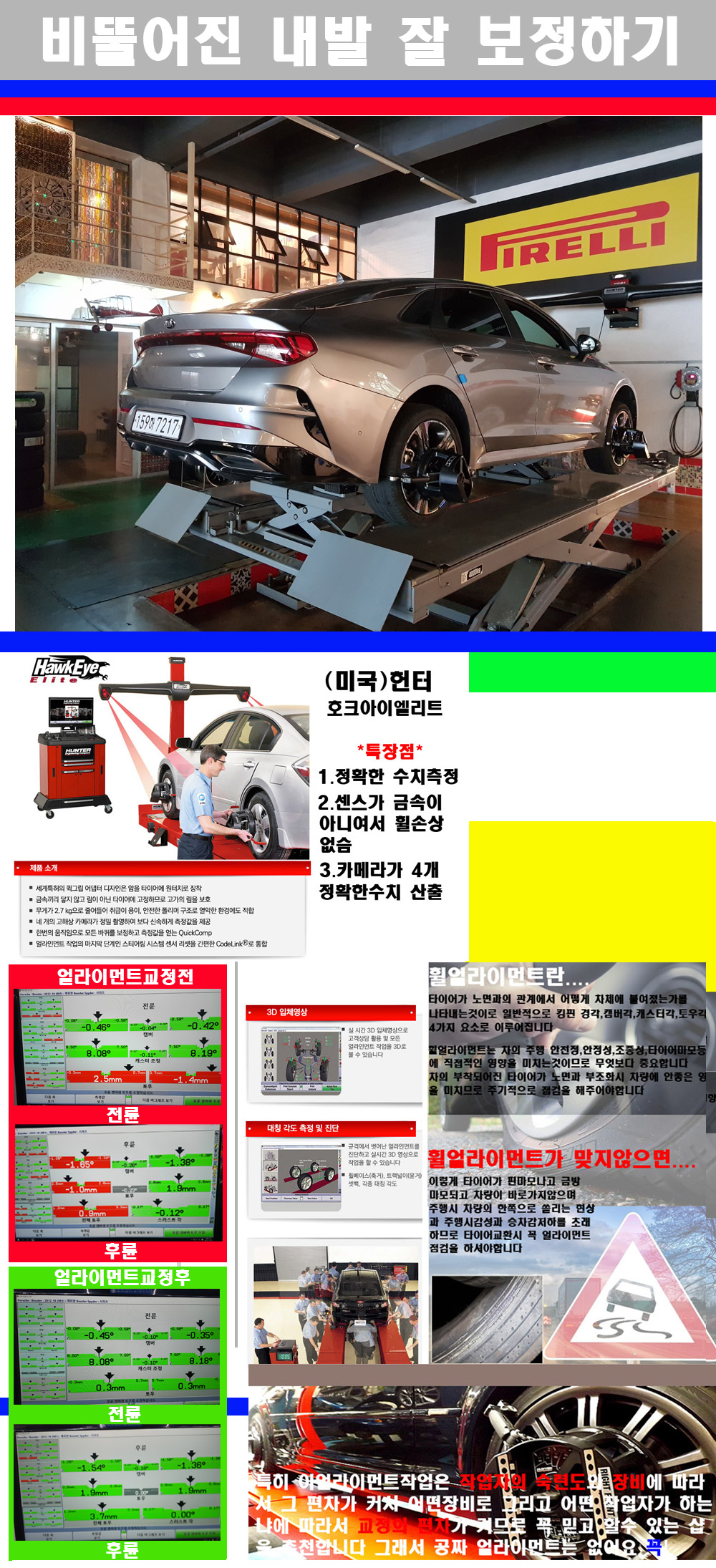 이후 미국 헌터사 호크아이엘리트 장비로 3D얼라이먼트를 진행했습니다 이장비는 현존하는 가장 진화된 얼라이먼트장비입니다 특히 4개의 고성능카메라가 장착되어져 있어 실시간으로 오차가 없는 측정값을 구현하며 바퀴당 각 휠센서 클램프가 프라스틱이며 타이어바닦면을 지지하는 방식이여서 휠의 손상이 없는것이 특징입니다 하지만 장비보다 차량의 얼라이먼트를 볼시 작업자의 정성과 그리고 능력과 숙련도가 관견이기에 꼭 휠얼라이먼트를 장사수단으로 하지않는 샵을 권장합니다 자사는 얼라이먼트정렬시 교정전 교정후를 구분하여 고객님께 직접 이수치값을 확인시켜드리고 작업을 하며 이후 각각의 특성을 가진 타이어들에 대해서 설명 및 관리요령 운전요령 같이 설명해드리고 있습니다 이후 타이어와 휠의 정확한 발란스값과 진동값을 보정후 헌터사 호크아이엘리트 3D얼라이먼트장비로 공장에서 처음 출고될시의 팩토리값으로 교정하였습니다 그리고 타이어질소가스주입기로 3번정도 진공상태로 만든후 질소가스를 주입했습니다 질소가스주입시 가장 관견은 순도이기에 이런 여러번의 진공상태후 주입하고 빼주는 과정를 많이 해주어야합니다 질소가스의 주입시 타이어공기압의 저하가 덜하고 화합물질이 반응을 하지않아 소음전파력과 그리고 타이어안쪽에 수분을 발생하지않으며 타이어안쪽에서의 공기압이 팽창하지않아 타이어에 스트레스를 덜주게 됩니다 하지만 이부분도 공기속에 질소가 80%정도 존재하기에 미미한 차이이지만 질소순도를 높이고 주행시 좋은 점이 확연히 많기에 질소주입을 해드리고 있습니다 특히 고성능타이어나 하중값을 많이 주는 타이어일경우에는 위에서 언급한 부분에서 많이 차이를 보이고 있습니다 이후 타이어왁싱후 출고했습니다+ 감사합니다 |