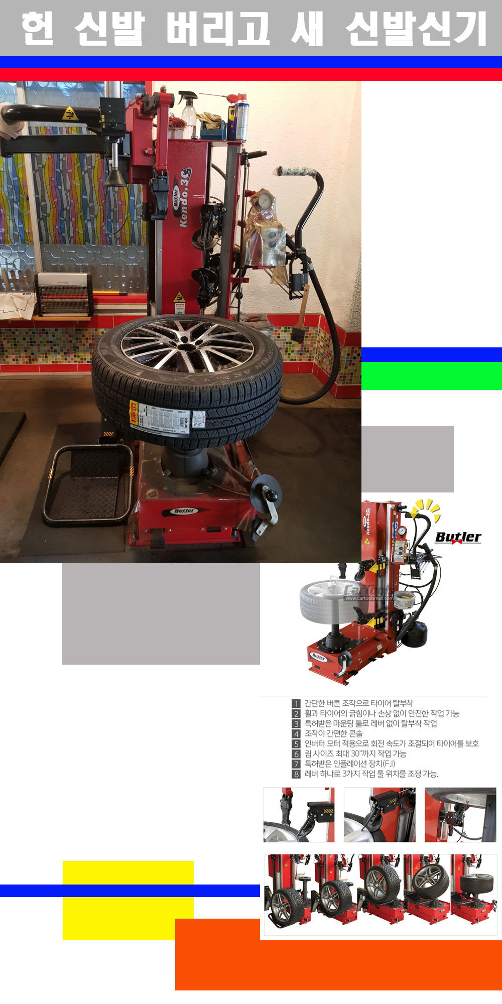 이태리 버틀러사의 켄도3.0S는 휠과 타이어와 조립과 분리시 전혀 제품에 손상을 주지않는 탈착기로 특히 센터락방식(중앙에서 휠를 고정하는 방식)이여서 휠의 중앙부위 잡아서 타이어를 탈부착하고 이후 상하롤러로 타이어를 탈부착합니다 특히 유니포미티작업(휠의 가장가벼운부분과 타이어의 가장 무거운부분을 매칭시키는 작업)시 작업자가 타이어를 정확한 지점에 휠과 매칭시킬수 있는 장점도 있습니다 유니포미티작업 불량시 과도한 진동값으로 핸들링불안 승차감저하 과도한 노면의 충격흡수를 가져와 주행감성을 해치는 첫번째 이유입니다 하지만 이런 작업을 무시하고 그냥 정적인 휠발란스작업만 하는것이 현실입니다 보통 타이어가격만 생각하시고 장착을 하시는데 꼭 이런 부분까지 챙길수 있는 샵을 권장합니다