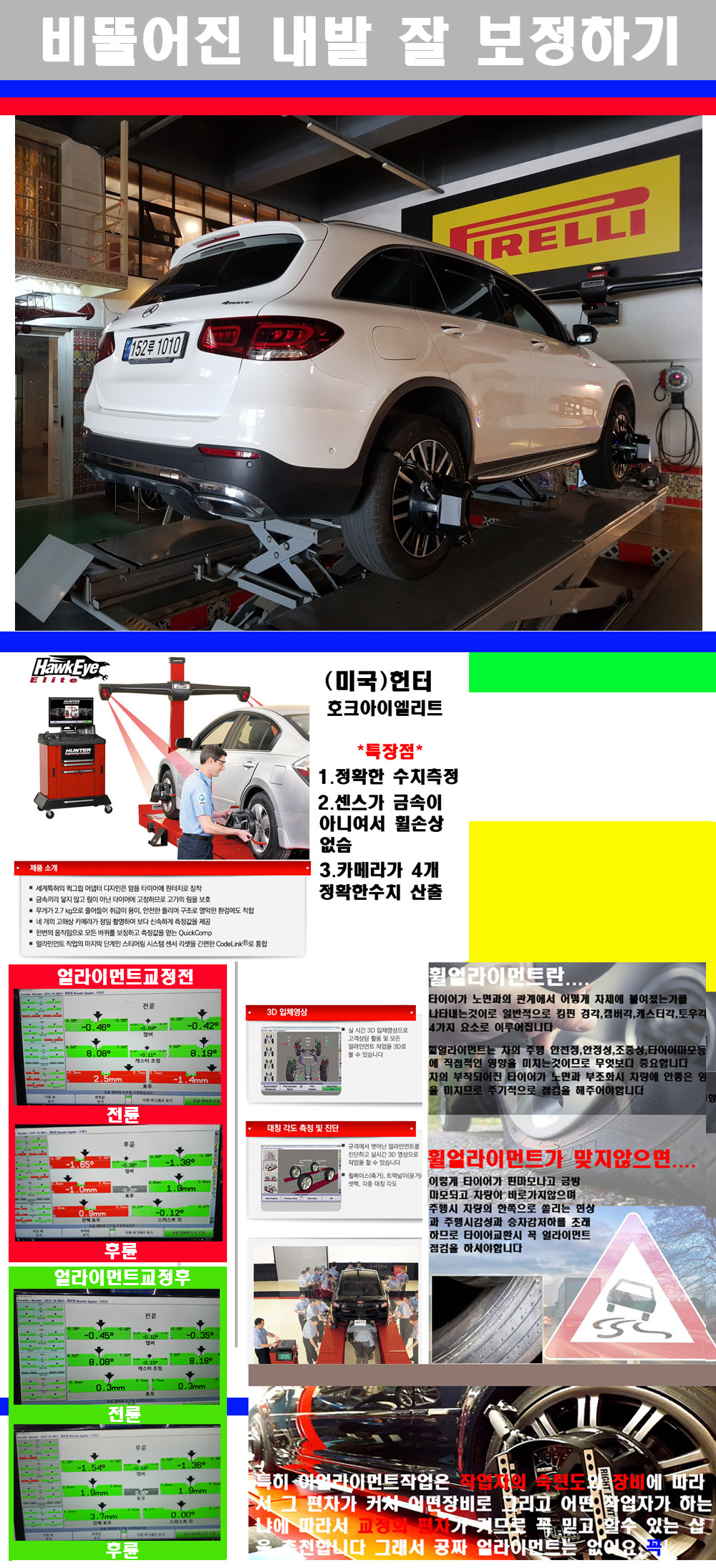 이후 미국 헌터사 호크아이엘리트 장비로 3D얼라이먼트를 진행했습니다 이장비는 현존하는 가장 진화된 얼라이먼트장비입니다 특히 4개의 고성능카메라가 장착되어져 있어 실시간으로 오차가 없는 측정값을 구현하며 바퀴당 각 휠센서 클램프가 프라스틱이며 타이어바닦면을 지지하는 방식이여서 휠의 손상이 없는것이 특징입니다 하지만 장비보다 차량의 얼라이먼트를 볼시 작업자의 정성과 그리고 능력과 숙련도가 관견이기에 꼭 휠얼라이먼트를 장사수단으로 하지않는 샵을 권장합니다 자사는 얼라이먼트정렬시 교정전 교정후를 구분하여 고객님께 직접 이수치값을 확인시켜드리고 작업을 하며 이후 각각의 특성을 가진 타이어들에 대해서 설명 및 관리요령 운전요령 같이 설명해드리고 있습니다 이후 타이어와 휠의 정확한 발란스값과 진동값을 보정후 헌터사 호크아이엘리트 3D얼라이먼트장비로 공장에서 처음 출고될시의 팩토리값으로 교정하였습니다 그리고 타이어질소가스주입기로 3번정도 진공상태로 만든후 질소가스를 주입했습니다 질소가스주입시 가장 관견은 순도이기에 이런 여러번의 진공상태후 주입하고 빼주는 과정를 많이 해주어야합니다 질소가스의 주입시 타이어공기압의 저하가 덜하고 화합물질이 반응을 하지않아 소음전파력과 그리고 타이어안쪽에 수분을 발생하지않으며 타이어안쪽에서의 공기압이 팽창하지않아 타이어에 스트레스를 덜주게 됩니다 하지만 이부분도 공기속에 질소가 80%정도 존재하기에 미미한 차이이지만 질소순도를 높이고 주행시 좋은 점이 확연히 많기에 질소주입을 해드리고 있습니다 특히 고성능타이어나 하중값을 많이 주는 타이어일경우에는 위에서 언급한 부분에서 많이 차이를 보이고 있습니다 이후 타이어왁싱후 출고했습니다+ 감사합니다 |