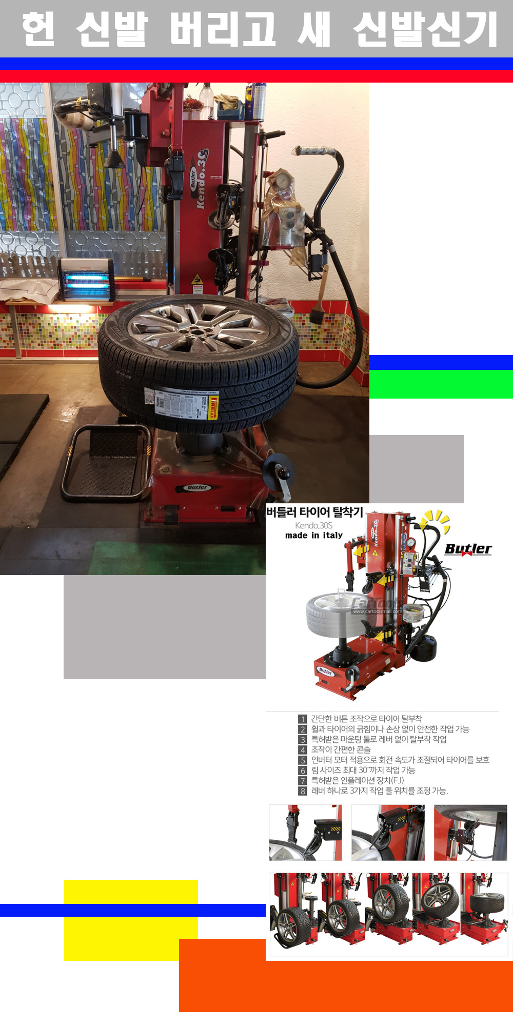 이태리 버틀러사의 켄도3.0S는 휠과 타이어와 조립과 분리시 전혀 제품에 손상을 주지않는 탈착기로 특히 센터락방식(중앙에서 휠를 고정하는 방식)이여서 휠의 중앙부위 잡아서 타이어를 탈부착하고 이후 상하롤러로 타이어를 탈부착합니다 특히 유니포미티작업(휠의 가장가벼운부분과 타이어의 가장 무거운부분을 매칭시키는 작업)시 작업자가 타이어를 정확한 지점에 휠과 매칭시킬수 있는 장점도 있습니다 유니포미티작업 불량시 과도한 진동값으로 핸들링불안 승차감저하 과도한 노면의 충격흡수를 가져와 주행감성을 해치는 첫번째 이유입니다 하지만 이런 작업을 무시하고 그냥 정적인 휠발란스작업만 하는것이 현실입니다 보통 타이어가격만 생각하시고 장착을 하시는데 꼭 이런 부분까지 챙길수 있는 샵을 권장합니다