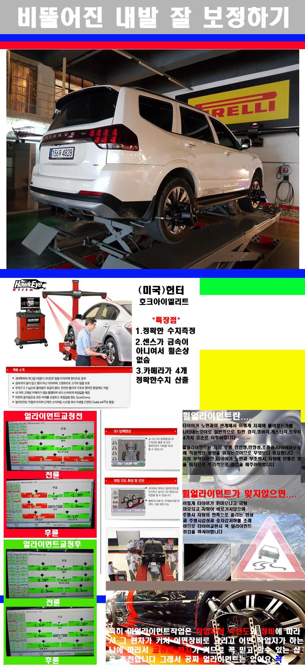 이후 미국 헌터사 호크아이엘리트 장비로 3D얼라이먼트를 진행했습니다 이장비는 현존하는 가장 진화된 얼라이먼트장비입니다 특히 4개의 고성능카메라가 장착되어져 있어 실시간으로 오차가 없는 측정값을 구현하며 바퀴당 각 휠센서 클램프가 프라스틱이며 타이어바닦면을 지지하는 방식이여서 휠의 손상이 없는것이 특징입니다 하지만 장비보다 차량의 얼라이먼트를 볼시 작업자의 정성과 그리고 능력과 숙련도가 관견이기에 꼭 휠얼라이먼트를 장사수단으로 하지않는 샵을 권장합니다 자사는 얼라이먼트정렬시 교정전 교정후를 구분하여 고객님께 직접 이수치값을 확인시켜드리고 작업을 하며 이후 각각의 특성을 가진 타이어들에 대해서 설명 및 관리요령 운전요령 같이 설명해드리고 있습니다 이후 타이어와 휠의 정확한 발란스값과 진동값을 보정후 헌터사 호크아이엘리트 3D얼라이먼트장비로 공장에서 처음 출고될시의 팩토리값으로 교정하였습니다 그리고 타이어질소가스주입기로 3번정도 진공상태로 만든후 질소가스를 주입했습니다 질소가스주입시 가장 관견은 순도이기에 이런 여러번의 진공상태후 주입하고 빼주는 과정를 많이 해주어야합니다 질소가스의 주입시 타이어공기압의 저하가 덜하고 화합물질이 반응을 하지않아 소음전파력과 그리고 타이어안쪽에 수분을 발생하지않으며 타이어안쪽에서의 공기압이 팽창하지않아 타이어에 스트레스를 덜주게 됩니다 하지만 이부분도 공기속에 질소가 80%정도 존재하기에 미미한 차이이지만 질소순도를 높이고 주행시 좋은 점이 확연히 많기에 질소주입을 해드리고 있습니다 특히 고성능타이어나 하중값을 많이 주는 타이어일경우에는 위에서 언급한 부분에서 많이 차이를 보이고 있습니다 이후 타이어왁싱후 출고했습니다+ 감사합니다 |