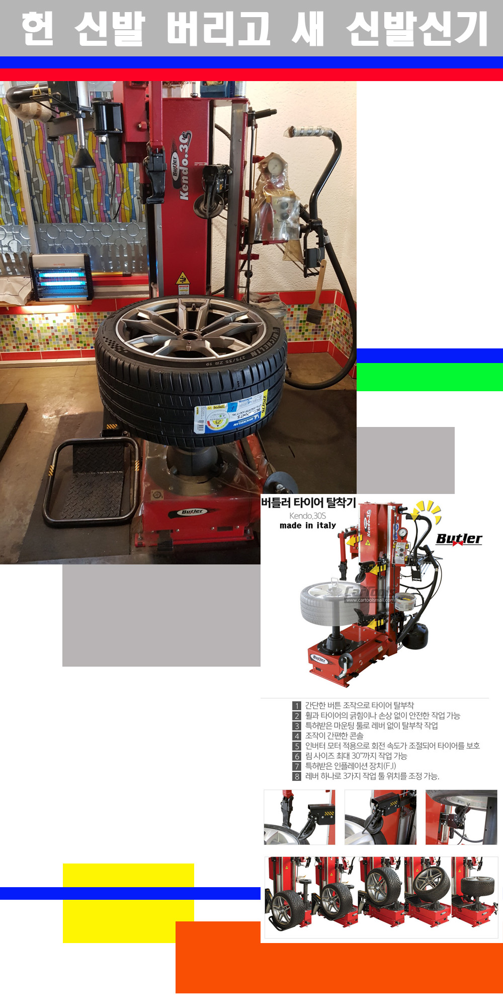 이태리 버틀러사의 켄도3.0S는 휠과 타이어와 조립과 분리시 전혀 제품에 손상을 주지않는 탈착기로 특히 센터락방식(중앙에서 휠를 고정하는 방식)이여서 휠의 중앙부위 잡아서 타이어를 탈부착하고 이후 상하롤러로 타이어를 탈부착합니다 특히 유니포미티작업(휠의 가장가벼운부분과 타이어의 가장 무거운부분을 매칭시키는 작업)시 작업자가 타이어를 정확한 지점에 휠과 매칭시킬수 있는 장점도 있습니다 유니포미티작업 불량시 과도한 진동값으로 핸들링불안 승차감저하 과도한 노면의 충격흡수를 가져와 주행감성을 해치는 첫번째 이유입니다 하지만 이런 작업을 무시하고 그냥 정적인 휠발란스작업만 하는것이 현실입니다 보통 타이어가격만 생각하시고 장착을 하시는데 꼭 이런 부분까지 챙길수 있는 샵을 권장합니다