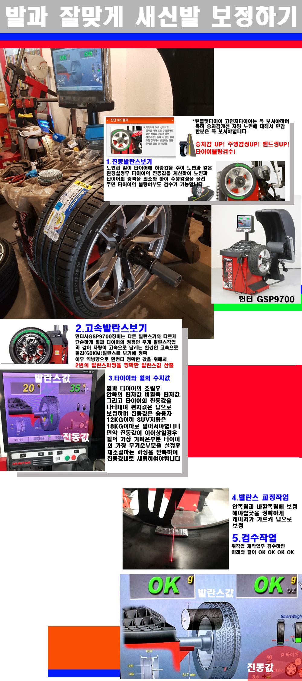 이후 미국 헌터사 GSP9700장비로 고속 및 진동발란스로 더욱더 작업의 정확도와 정밀도를 높였습니다 이장비는 노면에서 올라오는 진동값까지 계산하여 발란스값을 보는 방식으로 진동발란스기는 헌터사GSP9700장비가 유일합니다 이후 역방향으로 60키로의 고속으로 다시 발란스값을 보정하는 방식입니다 그래서 노면에서 올라오는 진동를 잡을수 있으며 특히 타이어의 노면력 측정으로 타이어의 불량여부까지도 검수가 가능한 장비입니다 특히 고속발란스 측정시 타사 발란스기와 틀리게 고속으로 발란스를 보기에 차량이 고속으로 달리는 시뮤레이션 구현이 가능하여 정확한 발란스값을 볼수가 있습니다 그리고 작업자에게는 불필요한 발란스납을 붙이지 않아 미관상으로 좋고 납을 절약하는 고객님에게도윈이고 작업자에게도 윈윈할수 있는 장비입니다 그리고 시중에서 고속진동발란스라고 말하시는 샵들이 많은데 꼭아셔야하는것은 고속발란스는 말그대로 발란스를 볼때 고속으로 돌리기에 60키로 전후 그리고 진동값을 계산하기위해서는 발란스기에 진동롤러가 있어야합니다 그래서 미국헌터사 GSP9700장비가 유일합니다