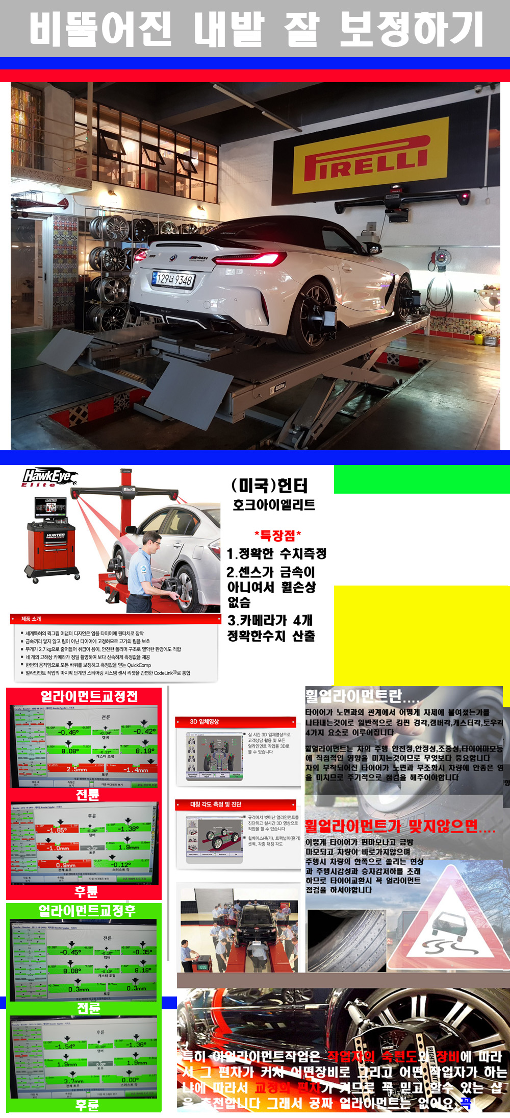 이후 미국 헌터사 호크아이엘리트 장비로 3D얼라이먼트를 진행했습니다 이장비는 현존하는 가장 진화된 얼라이먼트장비입니다 특히 4개의 고성능카메라가 장착되어져 있어 실시간으로 오차가 없는 측정값을 구현하며 바퀴당 각 휠센서 클램프가 프라스틱이며 타이어바닦면을 지지하는 방식이여서 휠의 손상이 없는것이 특징입니다 하지만 장비보다 차량의 얼라이먼트를 볼시 작업자의 정성과 그리고 능력과 숙련도가 관견이기에 꼭 휠얼라이먼트를 장사수단으로 하지않는 샵을 권장합니다 자사는 얼라이먼트정렬시 교정전 교정후를 구분하여 고객님께 직접 이수치값을 확인시켜드리고 작업을 하며 이후 각각의 특성을 가진 타이어들에 대해서 설명 및 관리요령 운전요령 같이 설명해드리고 있습니다 이후 타이어와 휠의 정확한 발란스값과 진동값을 보정후 헌터사 호크아이엘리트 3D얼라이먼트장비로 공장에서 처음 출고될시의 팩토리값으로 교정하였습니다 그리고 타이어질소가스주입기로 3번정도 진공상태로 만든후 질소가스를 주입했습니다 질소가스주입시 가장 관견은 순도이기에 이런 여러번의 진공상태후 주입하고 빼주는 과정를 많이 해주어야합니다 질소가스의 주입시 타이어공기압의 저하가 덜하고 화합물질이 반응을 하지않아 소음전파력과 그리고 타이어안쪽에 수분을 발생하지않으며 타이어안쪽에서의 공기압이 팽창하지않아 타이어에 스트레스를 덜주게 됩니다 하지만 이부분도 공기속에 질소가 80%정도 존재하기에 미미한 차이이지만 질소순도를 높이고 주행시 좋은 점이 확연히 많기에 질소주입을 해드리고 있습니다 특히 고성능타이어나 하중값을 많이 주는 타이어일경우에는 위에서 언급한 부분에서 많이 차이를 보이고 있습니다 이후 타이어왁싱후 출고했습니다+ 감사합니다 |