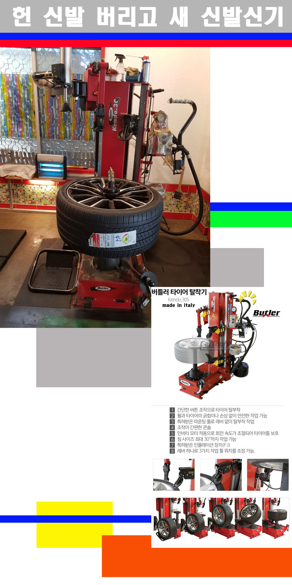 이태리 버틀러사의 켄도3.0S는 휠과 타이어와 조립과 분리시 전혀 제품에 손상을 주지않는 탈착기로 특히 센터락방식(중앙에서 휠를 고정하는 방식)이여서 휠의 중앙부위 잡아서 타이어를 탈부착하고 이후 상하롤러로 타이어를 탈부착합니다 특히 유니포미티작업(휠의 가장가벼운부분과 타이어의 가장 무거운부분을 매칭시키는 작업)시 작업자가 타이어를 정확한 지점에 휠과 매칭시킬수 있는 장점도 있습니다 유니포미티작업 불량시 과도한 진동값으로 핸들링불안 승차감저하 과도한 노면의 충격흡수를 가져와 주행감성을 해치는 첫번째 이유입니다 하지만 이런 작업을 무시하고 그냥 정적인 휠발란스작업만 하는것이 현실입니다 보통 타이어가격만 생각하시고 장착을 하시는데 꼭 이런 부분까지 챙길수 있는 샵을 권장합니다