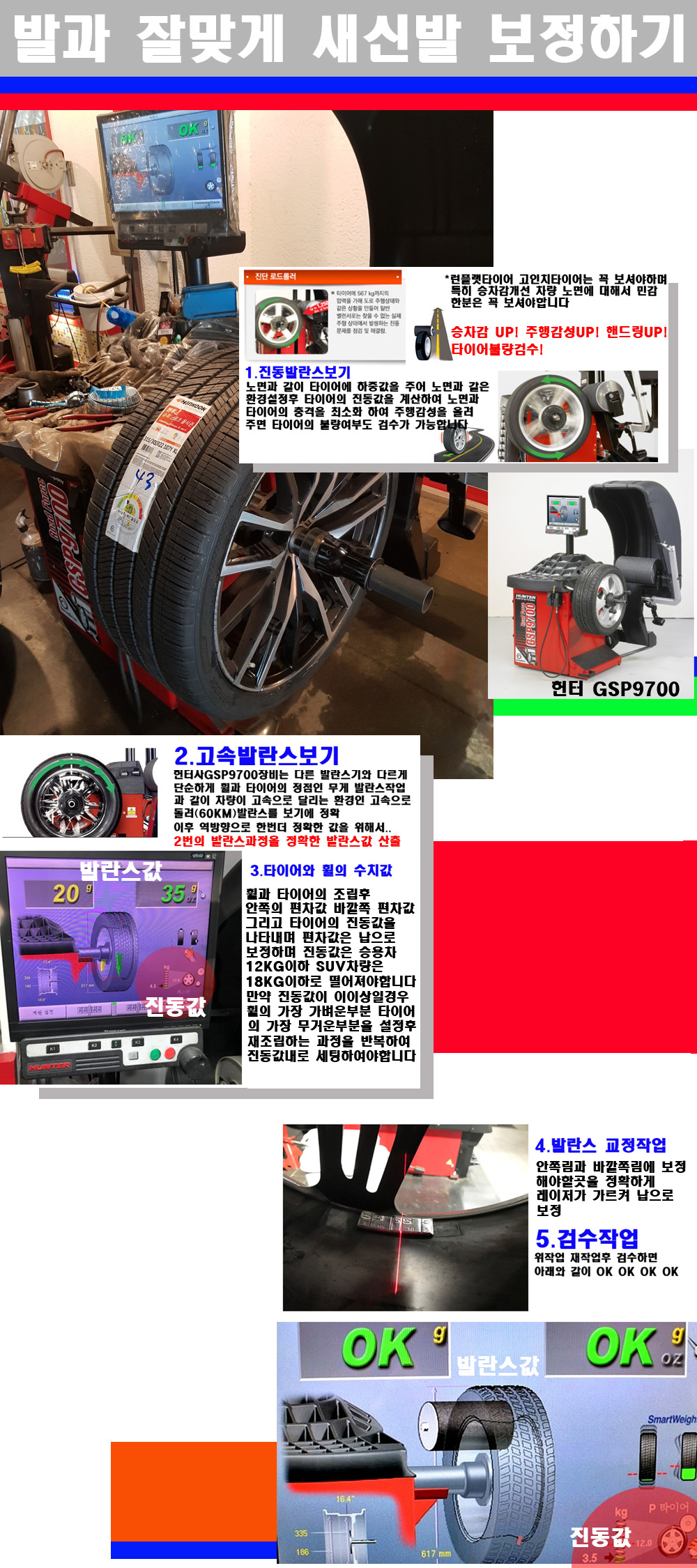 이후 미국 헌터사 GSP9700장비로 고속 및 진동발란스로 더욱더 작업의 정확도와 정밀도를 높였습니다 이장비는 노면에서 올라오는 진동값까지 계산하여 발란스값을 보는 방식으로 진동발란스기는 헌터사GSP9700장비가 유일합니다 이후 역방향으로 60키로의 고속으로 다시 발란스값을 보정하는 방식입니다 그래서 노면에서 올라오는 진동를 잡을수 있으며 특히 타이어의 노면력 측정으로 타이어의 불량여부까지도 검수가 가능한 장비입니다 특히 고속발란스 측정시 타사 발란스기와 틀리게 고속으로 발란스를 보기에 차량이 고속으로 달리는 시뮤레이션 구현이 가능하여 정확한 발란스값을 볼수가 있습니다 그리고 작업자에게는 불필요한 발란스납을 붙이지 않아 미관상으로 좋고 납을 절약하는 고객님에게도윈이고 작업자에게도 윈윈할수 있는 장비입니다 그리고 시중에서 고속진동발란스라고 말하시는 샵들이 많은데 꼭아셔야하는것은 고속발란스는 말그대로 발란스를 볼때 고속으로 돌리기에 60키로 전후 그리고 진동값을 계산하기위해서는 발란스기에 진동롤러가 있어야합니다 그래서 미국헌터사 GSP9700장비가 유일합니다