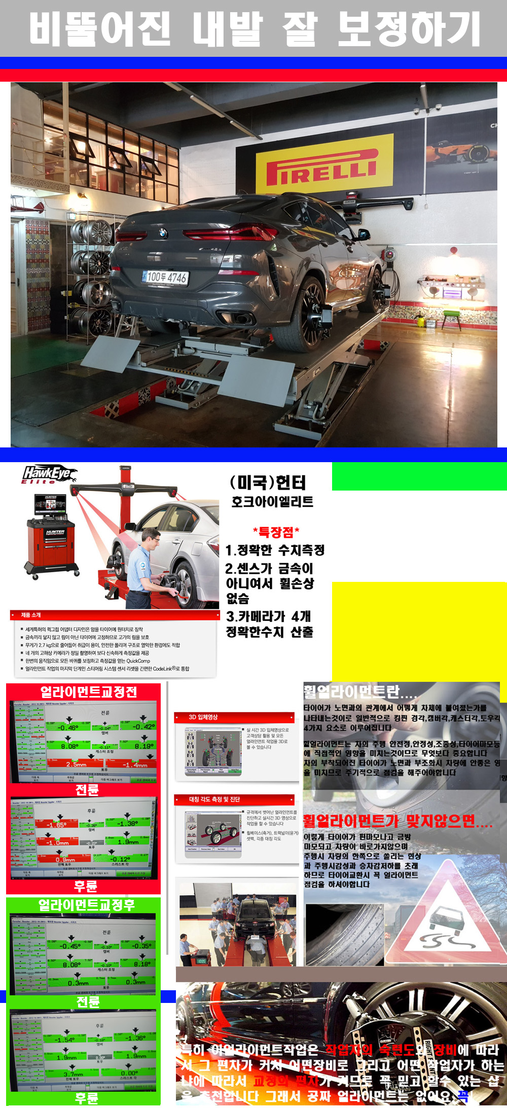 이후 미국 헌터사 호크아이엘리트 장비로 3D얼라이먼트를 진행했습니다 이장비는 현존하는 가장 진화된 얼라이먼트장비입니다 특히 4개의 고성능카메라가 장착되어져 있어 실시간으로 오차가 없는 측정값을 구현하며 바퀴당 각 휠센서 클램프가 프라스틱이며 타이어바닦면을 지지하는 방식이여서 휠의 손상이 없는것이 특징입니다 하지만 장비보다 차량의 얼라이먼트를 볼시 작업자의 정성과 그리고 능력과 숙련도가 관견이기에 꼭 휠얼라이먼트를 장사수단으로 하지않는 샵을 권장합니다 자사는 얼라이먼트정렬시 교정전 교정후를 구분하여 고객님께 직접 이수치값을 확인시켜드리고 작업을 하며 이후 각각의 특성을 가진 타이어들에 대해서 설명 및 관리요령 운전요령 같이 설명해드리고 있습니다 이후 타이어와 휠의 정확한 발란스값과 진동값을 보정후 헌터사 호크아이엘리트 3D얼라이먼트장비로 공장에서 처음 출고될시의 팩토리값으로 교정하였습니다 그리고 타이어질소가스주입기로 3번정도 진공상태로 만든후 질소가스를 주입했습니다 질소가스주입시 가장 관견은 순도이기에 이런 여러번의 진공상태후 주입하고 빼주는 과정를 많이 해주어야합니다 질소가스의 주입시 타이어공기압의 저하가 덜하고 화합물질이 반응을 하지않아 소음전파력과 그리고 타이어안쪽에 수분을 발생하지않으며 타이어안쪽에서의 공기압이 팽창하지않아 타이어에 스트레스를 덜주게 됩니다 하지만 이부분도 공기속에 질소가 80%정도 존재하기에 미미한 차이이지만 질소순도를 높이고 주행시 좋은 점이 확연히 많기에 질소주입을 해드리고 있습니다 특히 고성능타이어나 하중값을 많이 주는 타이어일경우에는 위에서 언급한 부분에서 많이 차이를 보이고 있습니다 이후 타이어왁싱후 출고했습니다+ 감사합니다 |