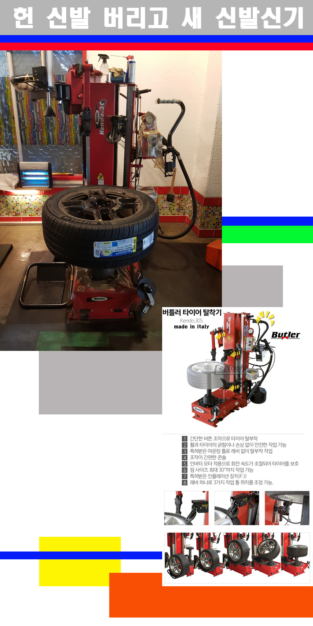 이태리 버틀러사의 켄도3.0S는 휠과 타이어와 조립과 분리시 전혀 제품에 손상을 주지않는 탈착기로 특히 센터락방식(중앙에서 휠를 고정하는 방식)이여서 휠의 중앙부위 잡아서 타이어를 탈부착하고 이후 상하롤러로 타이어를 탈부착합니다 특히 유니포미티작업(휠의 가장가벼운부분과 타이어의 가장 무거운부분을 매칭시키는 작업)시 작업자가 타이어를 정확한 지점에 휠과 매칭시킬수 있는 장점도 있습니다 유니포미티작업 불량시 과도한 진동값으로 핸들링불안 승차감저하 과도한 노면의 충격흡수를 가져와 주행감성을 해치는 첫번째 이유입니다 하지만 이런 작업을 무시하고 그냥 정적인 휠발란스작업만 하는것이 현실입니다 보통 타이어가격만 생각하시고 장착을 하시는데 꼭 이런 부분까지 챙길수 있는 샵을 권장합니다