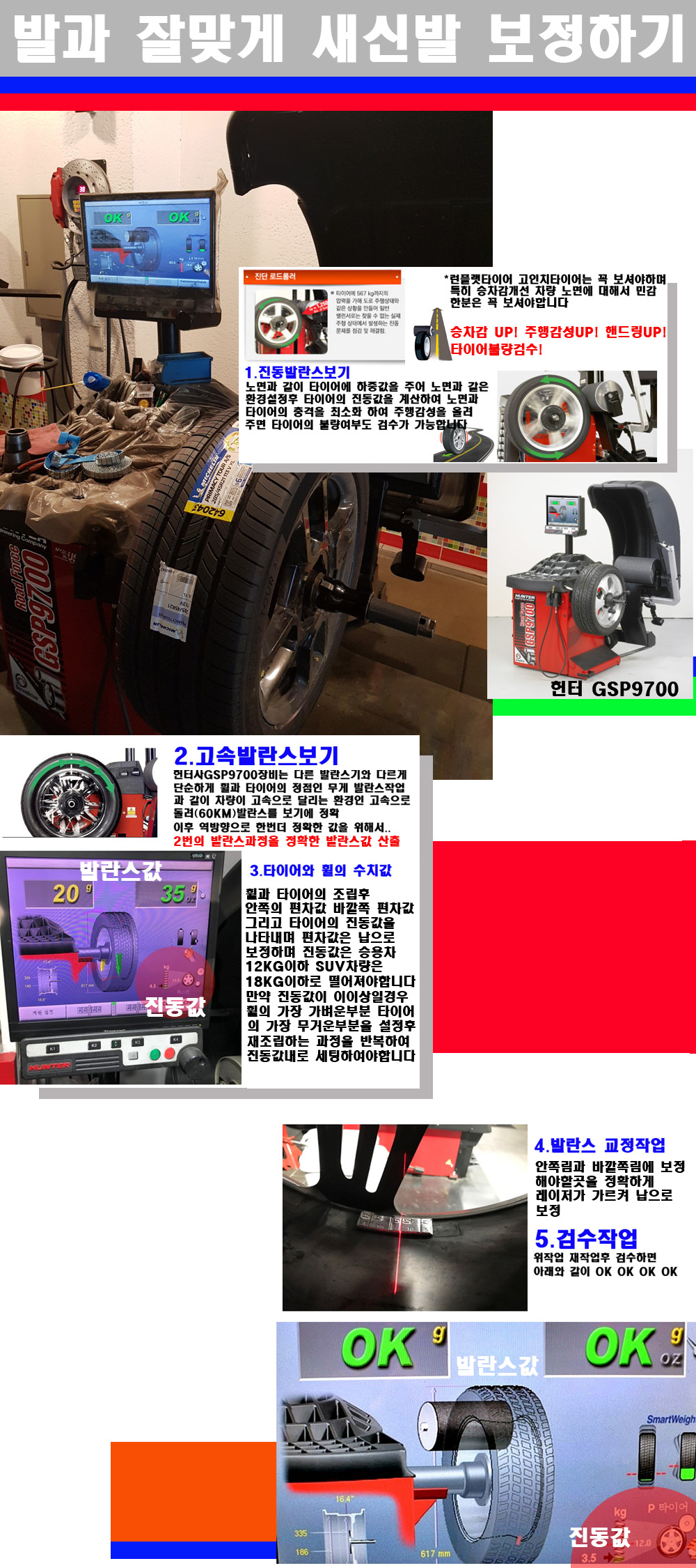이후 미국 헌터사 GSP9700장비로 고속 및 진동발란스로 더욱더 작업의 정확도와 정밀도를 높였습니다 이장비는 노면에서 올라오는 진동값까지 계산하여 발란스값을 보는 방식으로 진동발란스기는 헌터사GSP9700장비가 유일합니다 이후 역방향으로 60키로의 고속으로 다시 발란스값을 보정하는 방식입니다 그래서 노면에서 올라오는 진동를 잡을수 있으며 특히 타이어의 노면력 측정으로 타이어의 불량여부까지도 검수가 가능한 장비입니다 특히 고속발란스 측정시 타사 발란스기와 틀리게 고속으로 발란스를 보기에 차량이 고속으로 달리는 시뮤레이션 구현이 가능하여 정확한 발란스값을 볼수가 있습니다 그리고 작업자에게는 불필요한 발란스납을 붙이지 않아 미관상으로 좋고 납을 절약하는 고객님에게도윈이고 작업자에게도 윈윈할수 있는 장비입니다 그리고 시중에서 고속진동발란스라고 말하시는 샵들이 많은데 꼭아셔야하는것은 고속발란스는 말그대로 발란스를 볼때 고속으로 돌리기에 60키로 전후 그리고 진동값을 계산하기위해서는 발란스기에 진동롤러가 있어야합니다 그래서 미국헌터사 GSP9700장비가 유일합니다