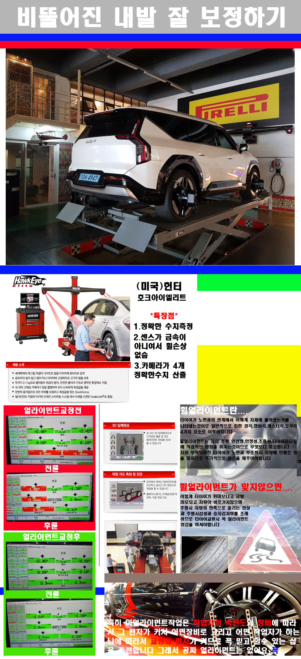 이후 미국 헌터사 호크아이엘리트 장비로 3D얼라이먼트를 진행했습니다 이장비는 현존하는 가장 진화된 얼라이먼트장비입니다 특히 4개의 고성능카메라가 장착되어져 있어 실시간으로 오차가 없는 측정값을 구현하며 바퀴당 각 휠센서 클램프가 프라스틱이며 타이어바닦면을 지지하는 방식이여서 휠의 손상이 없는것이 특징입니다 하지만 장비보다 차량의 얼라이먼트를 볼시 작업자의 정성과 그리고 능력과 숙련도가 관견이기에 꼭 휠얼라이먼트를 장사수단으로 하지않는 샵을 권장합니다 자사는 얼라이먼트정렬시 교정전 교정후를 구분하여 고객님께 직접 이수치값을 확인시켜드리고 작업을 하며 이후 각각의 특성을 가진 타이어들에 대해서 설명 및 관리요령 운전요령 같이 설명해드리고 있습니다 이후 타이어와 휠의 정확한 발란스값과 진동값을 보정후 헌터사 호크아이엘리트 3D얼라이먼트장비로 공장에서 처음 출고될시의 팩토리값으로 교정하였습니다 그리고 타이어질소가스주입기로 3번정도 진공상태로 만든후 질소가스를 주입했습니다 질소가스주입시 가장 관견은 순도이기에 이런 여러번의 진공상태후 주입하고 빼주는 과정를 많이 해주어야합니다 질소가스의 주입시 타이어공기압의 저하가 덜하고 화합물질이 반응을 하지않아 소음전파력과 그리고 타이어안쪽에 수분을 발생하지않으며 타이어안쪽에서의 공기압이 팽창하지않아 타이어에 스트레스를 덜주게 됩니다 하지만 이부분도 공기속에 질소가 80%정도 존재하기에 미미한 차이이지만 질소순도를 높이고 주행시 좋은 점이 확연히 많기에 질소주입을 해드리고 있습니다 특히 고성능타이어나 하중값을 많이 주는 타이어일경우에는 위에서 언급한 부분에서 많이 차이를 보이고 있습니다 이후 타이어왁싱후 출고했습니다+ 감사합니다 |