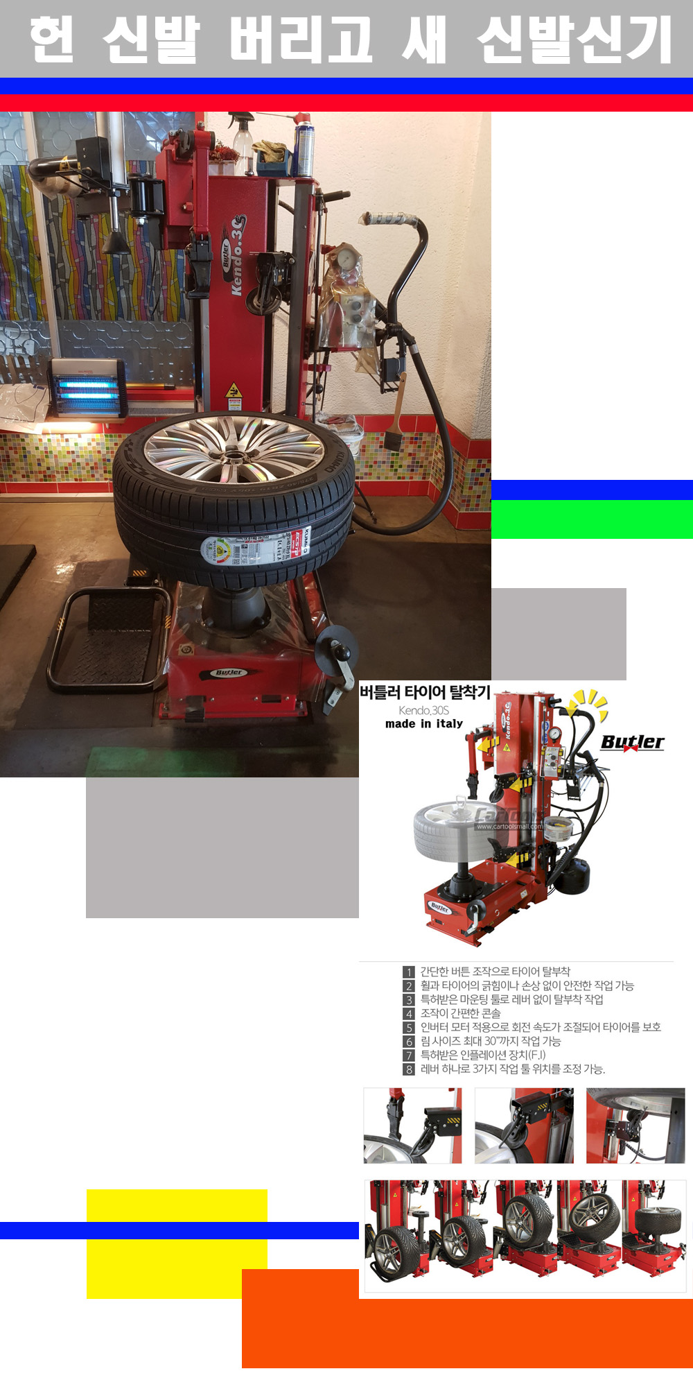 이태리 버틀러사의 켄도3.0S는 휠과 타이어와 조립과 분리시 전혀 제품에 손상을 주지않는 탈착기로 특히 센터락방식(중앙에서 휠를 고정하는 방식)이여서 휠의 중앙부위 잡아서 타이어를 탈부착하고 이후 상하롤러로 타이어를 탈부착합니다 특히 유니포미티작업(휠의 가장가벼운부분과 타이어의 가장 무거운부분을 매칭시키는 작업)시 작업자가 타이어를 정확한 지점에 휠과 매칭시킬수 있는 장점도 있습니다 유니포미티작업 불량시 과도한 진동값으로 핸들링불안 승차감저하 과도한 노면의 충격흡수를 가져와 주행감성을 해치는 첫번째 이유입니다 하지만 이런 작업을 무시하고 그냥 정적인 휠발란스작업만 하는것이 현실입니다 보통 타이어가격만 생각하시고 장착을 하시는데 꼭 이런 부분까지 챙길수 있는 샵을 권장합니다