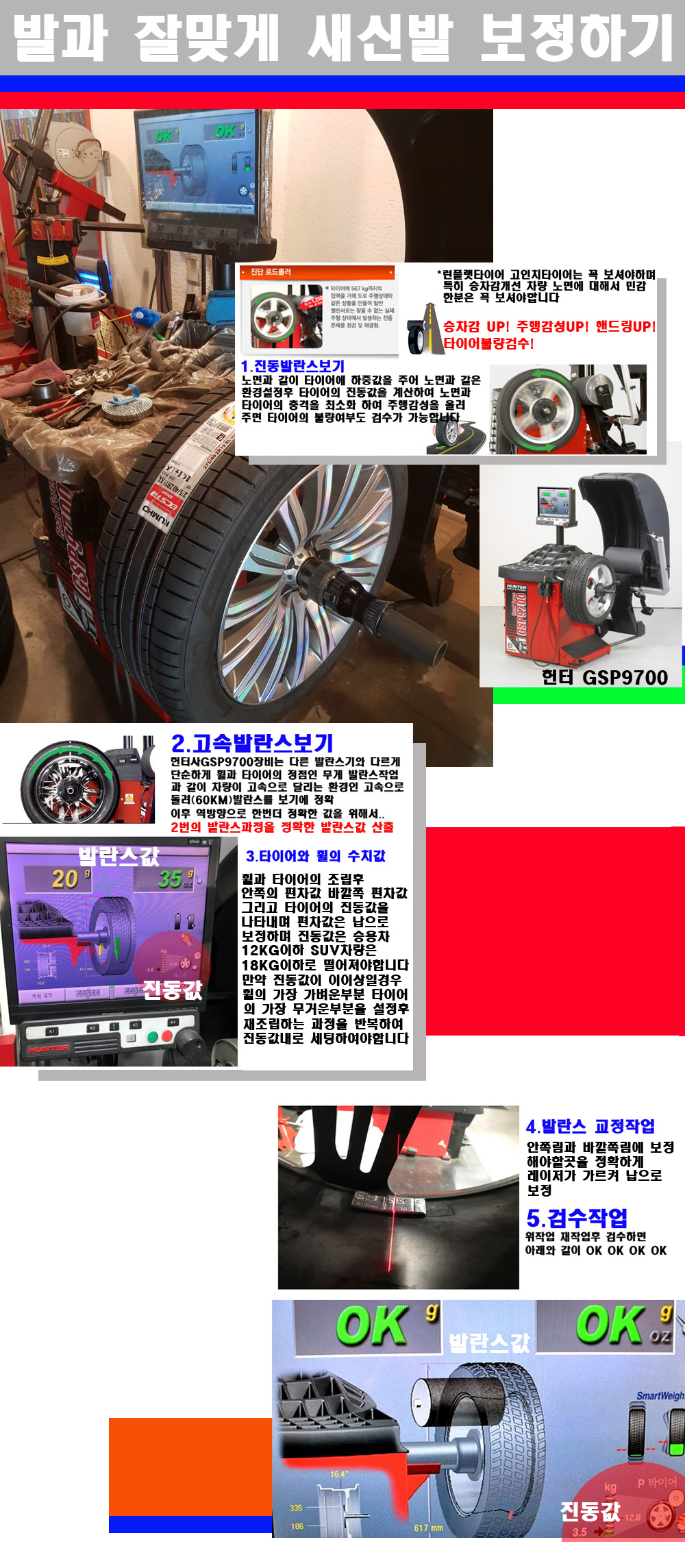 이후 미국 헌터사 GSP9700장비로 고속 및 진동발란스로 더욱더 작업의 정확도와 정밀도를 높였습니다 이장비는 노면에서 올라오는 진동값까지 계산하여 발란스값을 보는 방식으로 진동발란스기는 헌터사GSP9700장비가 유일합니다 이후 역방향으로 60키로의 고속으로 다시 발란스값을 보정하는 방식입니다 그래서 노면에서 올라오는 진동를 잡을수 있으며 특히 타이어의 노면력 측정으로 타이어의 불량여부까지도 검수가 가능한 장비입니다 특히 고속발란스 측정시 타사 발란스기와 틀리게 고속으로 발란스를 보기에 차량이 고속으로 달리는 시뮤레이션 구현이 가능하여 정확한 발란스값을 볼수가 있습니다 그리고 작업자에게는 불필요한 발란스납을 붙이지 않아 미관상으로 좋고 납을 절약하는 고객님에게도윈이고 작업자에게도 윈윈할수 있는 장비입니다 그리고 시중에서 고속진동발란스라고 말하시는 샵들이 많은데 꼭아셔야하는것은 고속발란스는 말그대로 발란스를 볼때 고속으로 돌리기에 60키로 전후 그리고 진동값을 계산하기위해서는 발란스기에 진동롤러가 있어야합니다 그래서 미국헌터사 GSP9700장비가 유일합니다