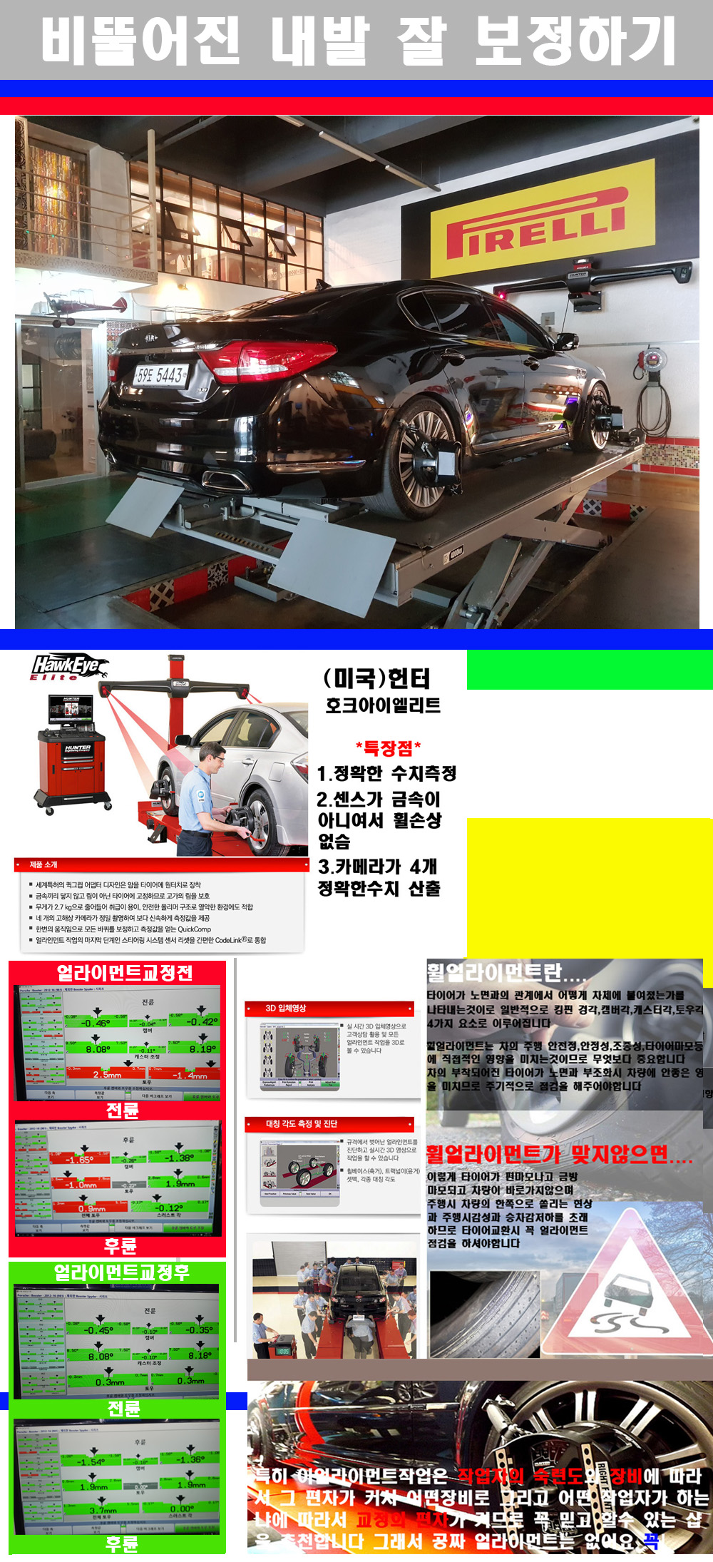 이후 미국 헌터사 호크아이엘리트 장비로 3D얼라이먼트를 진행했습니다 이장비는 현존하는 가장 진화된 얼라이먼트장비입니다 특히 4개의 고성능카메라가 장착되어져 있어 실시간으로 오차가 없는 측정값을 구현하며 바퀴당 각 휠센서 클램프가 프라스틱이며 타이어바닦면을 지지하는 방식이여서 휠의 손상이 없는것이 특징입니다 하지만 장비보다 차량의 얼라이먼트를 볼시 작업자의 정성과 그리고 능력과 숙련도가 관견이기에 꼭 휠얼라이먼트를 장사수단으로 하지않는 샵을 권장합니다 자사는 얼라이먼트정렬시 교정전 교정후를 구분하여 고객님께 직접 이수치값을 확인시켜드리고 작업을 하며 이후 각각의 특성을 가진 타이어들에 대해서 설명 및 관리요령 운전요령 같이 설명해드리고 있습니다 이후 타이어와 휠의 정확한 발란스값과 진동값을 보정후 헌터사 호크아이엘리트 3D얼라이먼트장비로 공장에서 처음 출고될시의 팩토리값으로 교정하였습니다 그리고 타이어질소가스주입기로 3번정도 진공상태로 만든후 질소가스를 주입했습니다 질소가스주입시 가장 관견은 순도이기에 이런 여러번의 진공상태후 주입하고 빼주는 과정를 많이 해주어야합니다 질소가스의 주입시 타이어공기압의 저하가 덜하고 화합물질이 반응을 하지않아 소음전파력과 그리고 타이어안쪽에 수분을 발생하지않으며 타이어안쪽에서의 공기압이 팽창하지않아 타이어에 스트레스를 덜주게 됩니다 하지만 이부분도 공기속에 질소가 80%정도 존재하기에 미미한 차이이지만 질소순도를 높이고 주행시 좋은 점이 확연히 많기에 질소주입을 해드리고 있습니다 특히 고성능타이어나 하중값을 많이 주는 타이어일경우에는 위에서 언급한 부분에서 많이 차이를 보이고 있습니다 이후 타이어왁싱후 출고했습니다+ 감사합니다 |