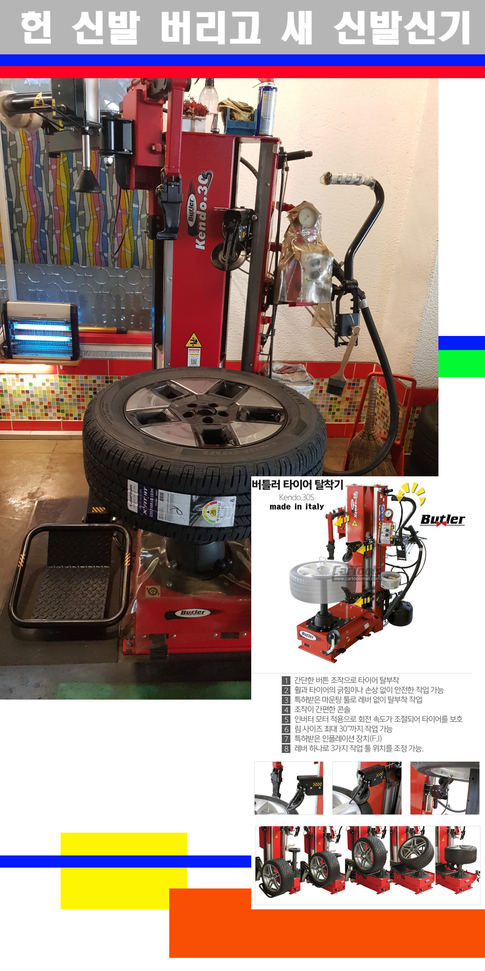 이태리 버틀러사의 켄도3.0S는 휠과 타이어와 조립과 분리시 전혀 제품에 손상을 주지않는 탈착기로 특히 센터락방식(중앙에서 휠를 고정하는 방식)이여서 휠의 중앙부위 잡아서 타이어를 탈부착하고 이후 상하롤러로 타이어를 탈부착합니다 특히 유니포미티작업(휠의 가장가벼운부분과 타이어의 가장 무거운부분을 매칭시키는 작업)시 작업자가 타이어를 정확한 지점에 휠과 매칭시킬수 있는 장점도 있습니다 유니포미티작업 불량시 과도한 진동값으로 핸들링불안 승차감저하 과도한 노면의 충격흡수를 가져와 주행감성을 해치는 첫번째 이유입니다 하지만 이런 작업을 무시하고 그냥 정적인 휠발란스작업만 하는것이 현실입니다 보통 타이어가격만 생각하시고 장착을 하시는데 꼭 이런 부분까지 챙길수 있는 샵을 권장합니다