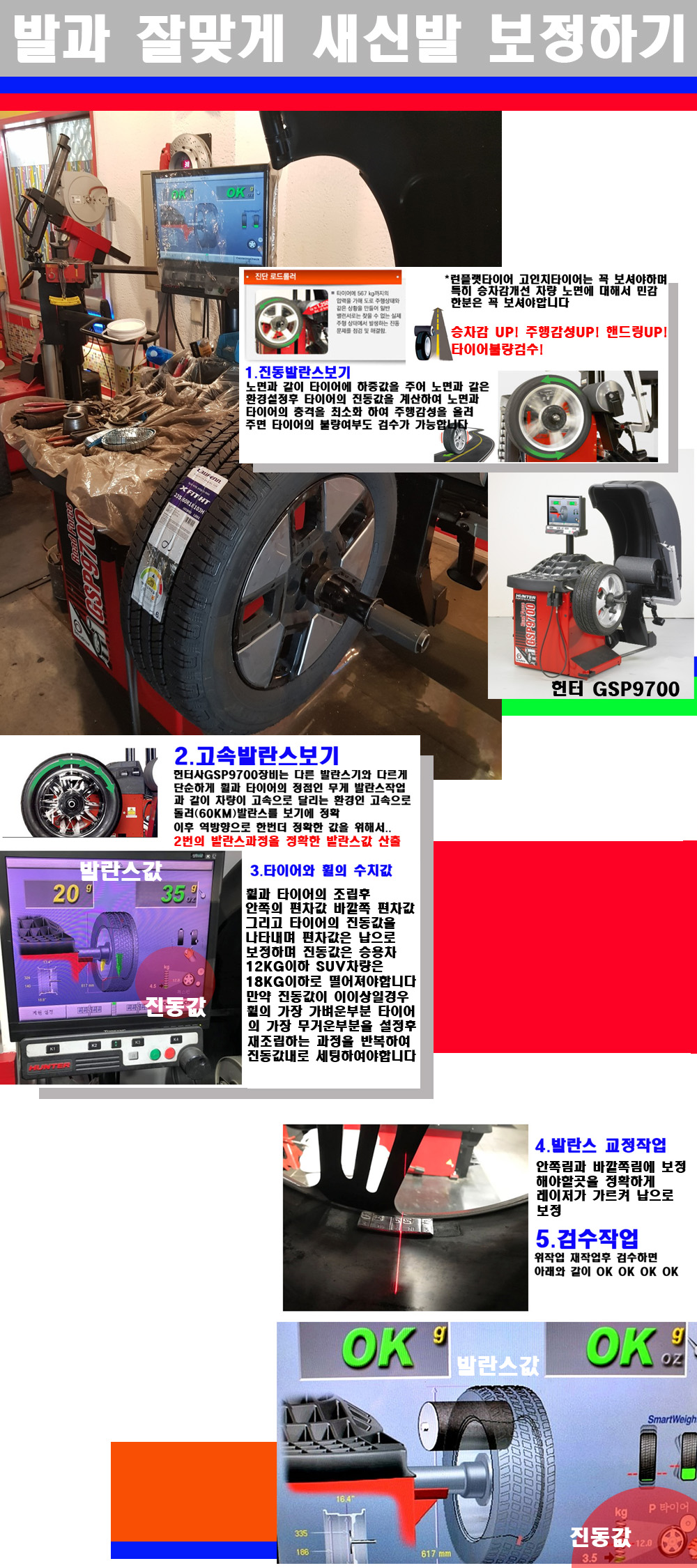 이후 미국 헌터사 GSP9700장비로 고속 및 진동발란스로 더욱더 작업의 정확도와 정밀도를 높였습니다 이장비는 노면에서 올라오는 진동값까지 계산하여 발란스값을 보는 방식으로 진동발란스기는 헌터사GSP9700장비가 유일합니다 이후 역방향으로 60키로의 고속으로 다시 발란스값을 보정하는 방식입니다 그래서 노면에서 올라오는 진동를 잡을수 있으며 특히 타이어의 노면력 측정으로 타이어의 불량여부까지도 검수가 가능한 장비입니다 특히 고속발란스 측정시 타사 발란스기와 틀리게 고속으로 발란스를 보기에 차량이 고속으로 달리는 시뮤레이션 구현이 가능하여 정확한 발란스값을 볼수가 있습니다 그리고 작업자에게는 불필요한 발란스납을 붙이지 않아 미관상으로 좋고 납을 절약하는 고객님에게도윈이고 작업자에게도 윈윈할수 있는 장비입니다 그리고 시중에서 고속진동발란스라고 말하시는 샵들이 많은데 꼭아셔야하는것은 고속발란스는 말그대로 발란스를 볼때 고속으로 돌리기에 60키로 전후 그리고 진동값을 계산하기위해서는 발란스기에 진동롤러가 있어야합니다 그래서 미국헌터사 GSP9700장비가 유일합니다