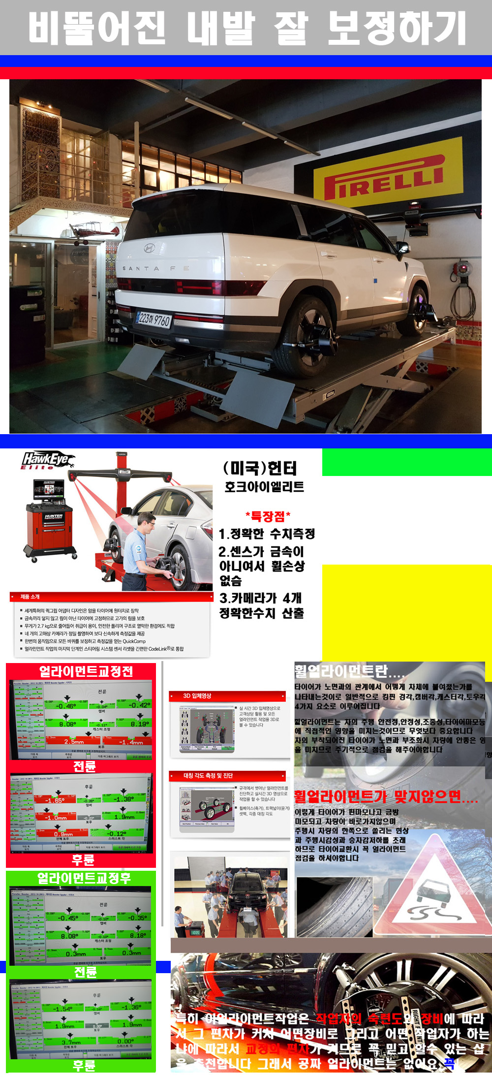 이후 미국 헌터사 호크아이엘리트 장비로 3D얼라이먼트를 진행했습니다 이장비는 현존하는 가장 진화된 얼라이먼트장비입니다 특히 4개의 고성능카메라가 장착되어져 있어 실시간으로 오차가 없는 측정값을 구현하며 바퀴당 각 휠센서 클램프가 프라스틱이며 타이어바닦면을 지지하는 방식이여서 휠의 손상이 없는것이 특징입니다 하지만 장비보다 차량의 얼라이먼트를 볼시 작업자의 정성과 그리고 능력과 숙련도가 관견이기에 꼭 휠얼라이먼트를 장사수단으로 하지않는 샵을 권장합니다 자사는 얼라이먼트정렬시 교정전 교정후를 구분하여 고객님께 직접 이수치값을 확인시켜드리고 작업을 하며 이후 각각의 특성을 가진 타이어들에 대해서 설명 및 관리요령 운전요령 같이 설명해드리고 있습니다 이후 타이어와 휠의 정확한 발란스값과 진동값을 보정후 헌터사 호크아이엘리트 3D얼라이먼트장비로 공장에서 처음 출고될시의 팩토리값으로 교정하였습니다 그리고 타이어질소가스주입기로 3번정도 진공상태로 만든후 질소가스를 주입했습니다 질소가스주입시 가장 관견은 순도이기에 이런 여러번의 진공상태후 주입하고 빼주는 과정를 많이 해주어야합니다 질소가스의 주입시 타이어공기압의 저하가 덜하고 화합물질이 반응을 하지않아 소음전파력과 그리고 타이어안쪽에 수분을 발생하지않으며 타이어안쪽에서의 공기압이 팽창하지않아 타이어에 스트레스를 덜주게 됩니다 하지만 이부분도 공기속에 질소가 80%정도 존재하기에 미미한 차이이지만 질소순도를 높이고 주행시 좋은 점이 확연히 많기에 질소주입을 해드리고 있습니다 특히 고성능타이어나 하중값을 많이 주는 타이어일경우에는 위에서 언급한 부분에서 많이 차이를 보이고 있습니다 이후 타이어왁싱후 출고했습니다+ 감사합니다 |