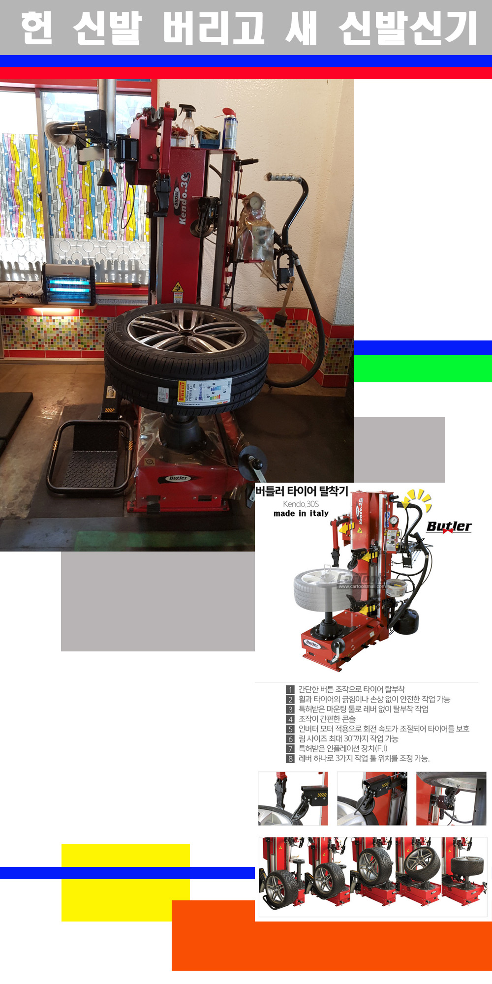이태리 버틀러사의 켄도3.0S는 휠과 타이어와 조립과 분리시 전혀 제품에 손상을 주지않는 탈착기로 특히 센터락방식(중앙에서 휠를 고정하는 방식)이여서 휠의 중앙부위 잡아서 타이어를 탈부착하고 이후 상하롤러로 타이어를 탈부착합니다 특히 유니포미티작업(휠의 가장가벼운부분과 타이어의 가장 무거운부분을 매칭시키는 작업)시 작업자가 타이어를 정확한 지점에 휠과 매칭시킬수 있는 장점도 있습니다 유니포미티작업 불량시 과도한 진동값으로 핸들링불안 승차감저하 과도한 노면의 충격흡수를 가져와 주행감성을 해치는 첫번째 이유입니다 하지만 이런 작업을 무시하고 그냥 정적인 휠발란스작업만 하는것이 현실입니다 보통 타이어가격만 생각하시고 장착을 하시는데 꼭 이런 부분까지 챙길수 있는 샵을 권장합니다