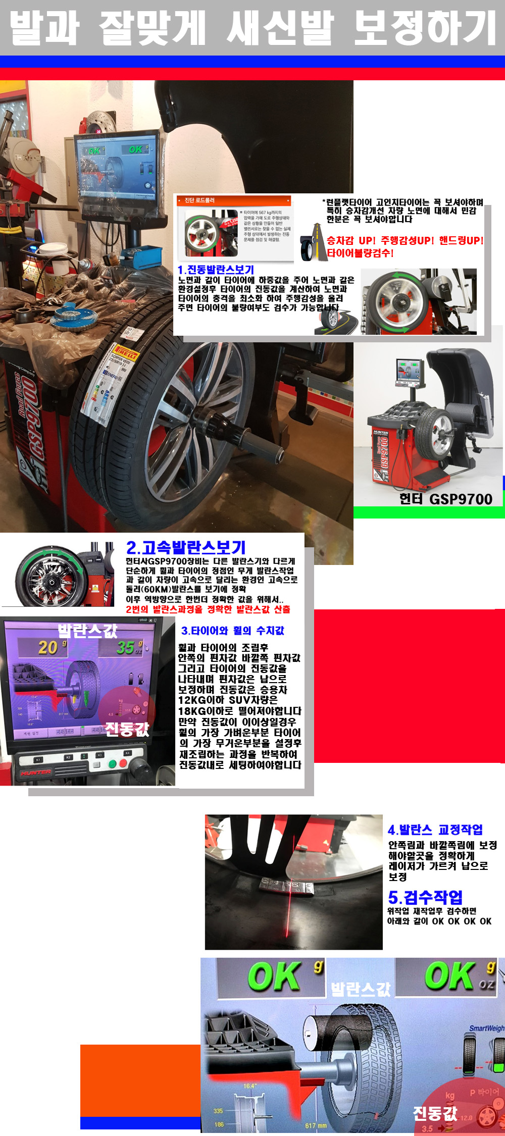 이후 미국 헌터사 GSP9700장비로 고속 및 진동발란스로 더욱더 작업의 정확도와 정밀도를 높였습니다 이장비는 노면에서 올라오는 진동값까지 계산하여 발란스값을 보는 방식으로 진동발란스기는 헌터사GSP9700장비가 유일합니다 이후 역방향으로 60키로의 고속으로 다시 발란스값을 보정하는 방식입니다 그래서 노면에서 올라오는 진동를 잡을수 있으며 특히 타이어의 노면력 측정으로 타이어의 불량여부까지도 검수가 가능한 장비입니다 특히 고속발란스 측정시 타사 발란스기와 틀리게 고속으로 발란스를 보기에 차량이 고속으로 달리는 시뮤레이션 구현이 가능하여 정확한 발란스값을 볼수가 있습니다 그리고 작업자에게는 불필요한 발란스납을 붙이지 않아 미관상으로 좋고 납을 절약하는 고객님에게도윈이고 작업자에게도 윈윈할수 있는 장비입니다 그리고 시중에서 고속진동발란스라고 말하시는 샵들이 많은데 꼭아셔야하는것은 고속발란스는 말그대로 발란스를 볼때 고속으로 돌리기에 60키로 전후 그리고 진동값을 계산하기위해서는 발란스기에 진동롤러가 있어야합니다 그래서 미국헌터사 GSP9700장비가 유일합니다