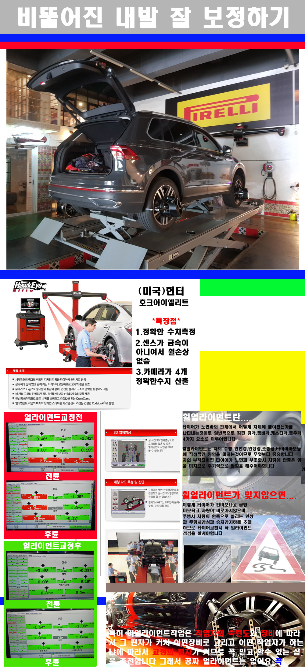 이후 미국 헌터사 호크아이엘리트 장비로 3D얼라이먼트를 진행했습니다 이장비는 현존하는 가장 진화된 얼라이먼트장비입니다 특히 4개의 고성능카메라가 장착되어져 있어 실시간으로 오차가 없는 측정값을 구현하며 바퀴당 각 휠센서 클램프가 프라스틱이며 타이어바닦면을 지지하는 방식이여서 휠의 손상이 없는것이 특징입니다 하지만 장비보다 차량의 얼라이먼트를 볼시 작업자의 정성과 그리고 능력과 숙련도가 관견이기에 꼭 휠얼라이먼트를 장사수단으로 하지않는 샵을 권장합니다 자사는 얼라이먼트정렬시 교정전 교정후를 구분하여 고객님께 직접 이수치값을 확인시켜드리고 작업을 하며 이후 각각의 특성을 가진 타이어들에 대해서 설명 및 관리요령 운전요령 같이 설명해드리고 있습니다 이후 타이어와 휠의 정확한 발란스값과 진동값을 보정후 헌터사 호크아이엘리트 3D얼라이먼트장비로 공장에서 처음 출고될시의 팩토리값으로 교정하였습니다 그리고 타이어질소가스주입기로 3번정도 진공상태로 만든후 질소가스를 주입했습니다 질소가스주입시 가장 관견은 순도이기에 이런 여러번의 진공상태후 주입하고 빼주는 과정를 많이 해주어야합니다 질소가스의 주입시 타이어공기압의 저하가 덜하고 화합물질이 반응을 하지않아 소음전파력과 그리고 타이어안쪽에 수분을 발생하지않으며 타이어안쪽에서의 공기압이 팽창하지않아 타이어에 스트레스를 덜주게 됩니다 하지만 이부분도 공기속에 질소가 80%정도 존재하기에 미미한 차이이지만 질소순도를 높이고 주행시 좋은 점이 확연히 많기에 질소주입을 해드리고 있습니다 특히 고성능타이어나 하중값을 많이 주는 타이어일경우에는 위에서 언급한 부분에서 많이 차이를 보이고 있습니다 이후 타이어왁싱후 출고했습니다+ 감사합니다 |