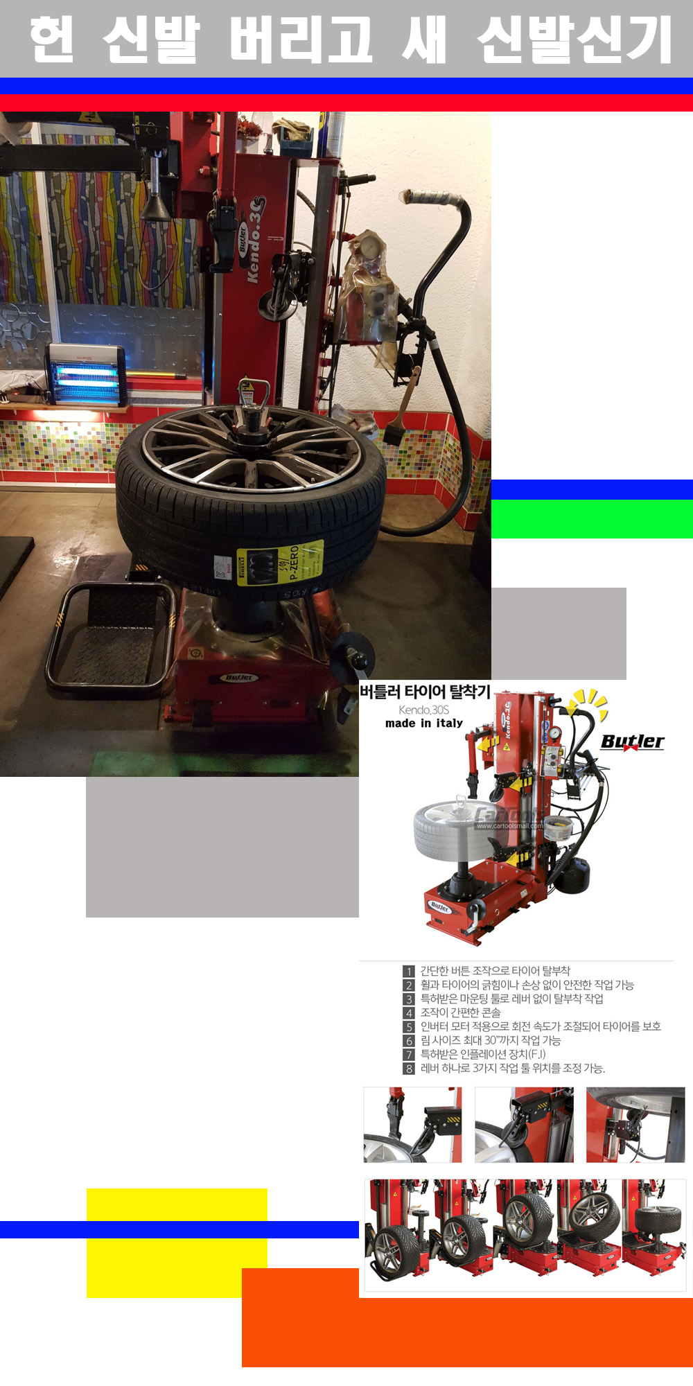 이태리 버틀러사의 켄도3.0S는 휠과 타이어와 조립과 분리시 전혀 제품에 손상을 주지않는 탈착기로 특히 센터락방식(중앙에서 휠를 고정하는 방식)이여서 휠의 중앙부위 잡아서 타이어를 탈부착하고 이후 상하롤러로 타이어를 탈부착합니다 특히 유니포미티작업(휠의 가장가벼운부분과 타이어의 가장 무거운부분을 매칭시키는 작업)시 작업자가 타이어를 정확한 지점에 휠과 매칭시킬수 있는 장점도 있습니다 유니포미티작업 불량시 과도한 진동값으로 핸들링불안 승차감저하 과도한 노면의 충격흡수를 가져와 주행감성을 해치는 첫번째 이유입니다 하지만 이런 작업을 무시하고 그냥 정적인 휠발란스작업만 하는것이 현실입니다 보통 타이어가격만 생각하시고 장착을 하시는데 꼭 이런 부분까지 챙길수 있는 샵을 권장합니다