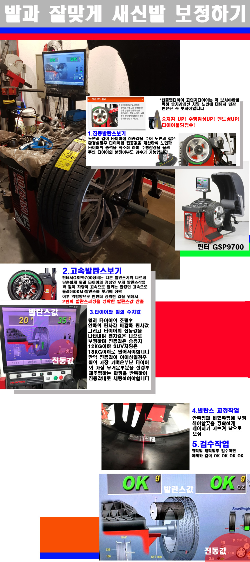 이후 미국 헌터사 GSP9700장비로 고속 및 진동발란스로 더욱더 작업의 정확도와 정밀도를 높였습니다 이장비는 노면에서 올라오는 진동값까지 계산하여 발란스값을 보는 방식으로 진동발란스기는 헌터사GSP9700장비가 유일합니다 이후 역방향으로 60키로의 고속으로 다시 발란스값을 보정하는 방식입니다 그래서 노면에서 올라오는 진동를 잡을수 있으며 특히 타이어의 노면력 측정으로 타이어의 불량여부까지도 검수가 가능한 장비입니다 특히 고속발란스 측정시 타사 발란스기와 틀리게 고속으로 발란스를 보기에 차량이 고속으로 달리는 시뮤레이션 구현이 가능하여 정확한 발란스값을 볼수가 있습니다 그리고 작업자에게는 불필요한 발란스납을 붙이지 않아 미관상으로 좋고 납을 절약하는 고객님에게도윈이고 작업자에게도 윈윈할수 있는 장비입니다 그리고 시중에서 고속진동발란스라고 말하시는 샵들이 많은데 꼭아셔야하는것은 고속발란스는 말그대로 발란스를 볼때 고속으로 돌리기에 60키로 전후 그리고 진동값을 계산하기위해서는 발란스기에 진동롤러가 있어야합니다 그래서 미국헌터사 GSP9700장비가 유일합니다