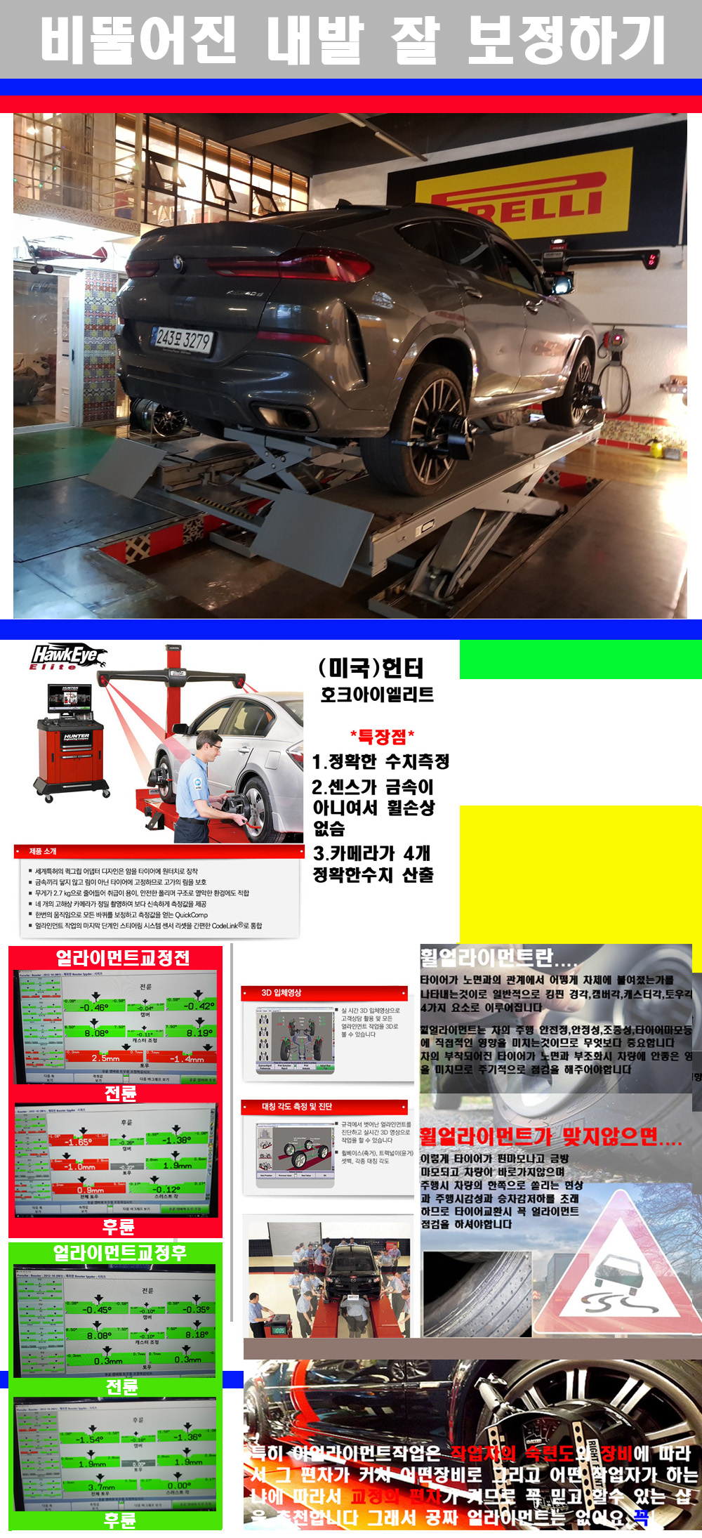 이후 미국 헌터사 호크아이엘리트 장비로 3D얼라이먼트를 진행했습니다 이장비는 현존하는 가장 진화된 얼라이먼트장비입니다 특히 4개의 고성능카메라가 장착되어져 있어 실시간으로 오차가 없는 측정값을 구현하며 바퀴당 각 휠센서 클램프가 프라스틱이며 타이어바닦면을 지지하는 방식이여서 휠의 손상이 없는것이 특징입니다 하지만 장비보다 차량의 얼라이먼트를 볼시 작업자의 정성과 그리고 능력과 숙련도가 관견이기에 꼭 휠얼라이먼트를 장사수단으로 하지않는 샵을 권장합니다 자사는 얼라이먼트정렬시 교정전 교정후를 구분하여 고객님께 직접 이수치값을 확인시켜드리고 작업을 하며 이후 각각의 특성을 가진 타이어들에 대해서 설명 및 관리요령 운전요령 같이 설명해드리고 있습니다 이후 타이어와 휠의 정확한 발란스값과 진동값을 보정후 헌터사 호크아이엘리트 3D얼라이먼트장비로 공장에서 처음 출고될시의 팩토리값으로 교정하였습니다 그리고 타이어질소가스주입기로 3번정도 진공상태로 만든후 질소가스를 주입했습니다 질소가스주입시 가장 관견은 순도이기에 이런 여러번의 진공상태후 주입하고 빼주는 과정를 많이 해주어야합니다 질소가스의 주입시 타이어공기압의 저하가 덜하고 화합물질이 반응을 하지않아 소음전파력과 그리고 타이어안쪽에 수분을 발생하지않으며 타이어안쪽에서의 공기압이 팽창하지않아 타이어에 스트레스를 덜주게 됩니다 하지만 이부분도 공기속에 질소가 80%정도 존재하기에 미미한 차이이지만 질소순도를 높이고 주행시 좋은 점이 확연히 많기에 질소주입을 해드리고 있습니다 특히 고성능타이어나 하중값을 많이 주는 타이어일경우에는 위에서 언급한 부분에서 많이 차이를 보이고 있습니다 이후 타이어왁싱후 출고했습니다+ 감사합니다 |