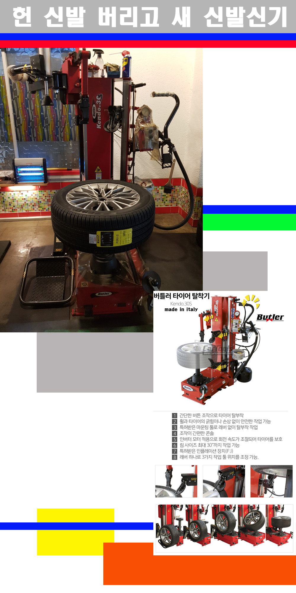 이태리 버틀러사의 켄도3.0S는 휠과 타이어와 조립과 분리시 전혀 제품에 손상을 주지않는 탈착기로 특히 센터락방식(중앙에서 휠를 고정하는 방식)이여서 휠의 중앙부위 잡아서 타이어를 탈부착하고 이후 상하롤러로 타이어를 탈부착합니다 특히 유니포미티작업(휠의 가장가벼운부분과 타이어의 가장 무거운부분을 매칭시키는 작업)시 작업자가 타이어를 정확한 지점에 휠과 매칭시킬수 있는 장점도 있습니다 유니포미티작업 불량시 과도한 진동값으로 핸들링불안 승차감저하 과도한 노면의 충격흡수를 가져와 주행감성을 해치는 첫번째 이유입니다 하지만 이런 작업을 무시하고 그냥 정적인 휠발란스작업만 하는것이 현실입니다 보통 타이어가격만 생각하시고 장착을 하시는데 꼭 이런 부분까지 챙길수 있는 샵을 권장합니다