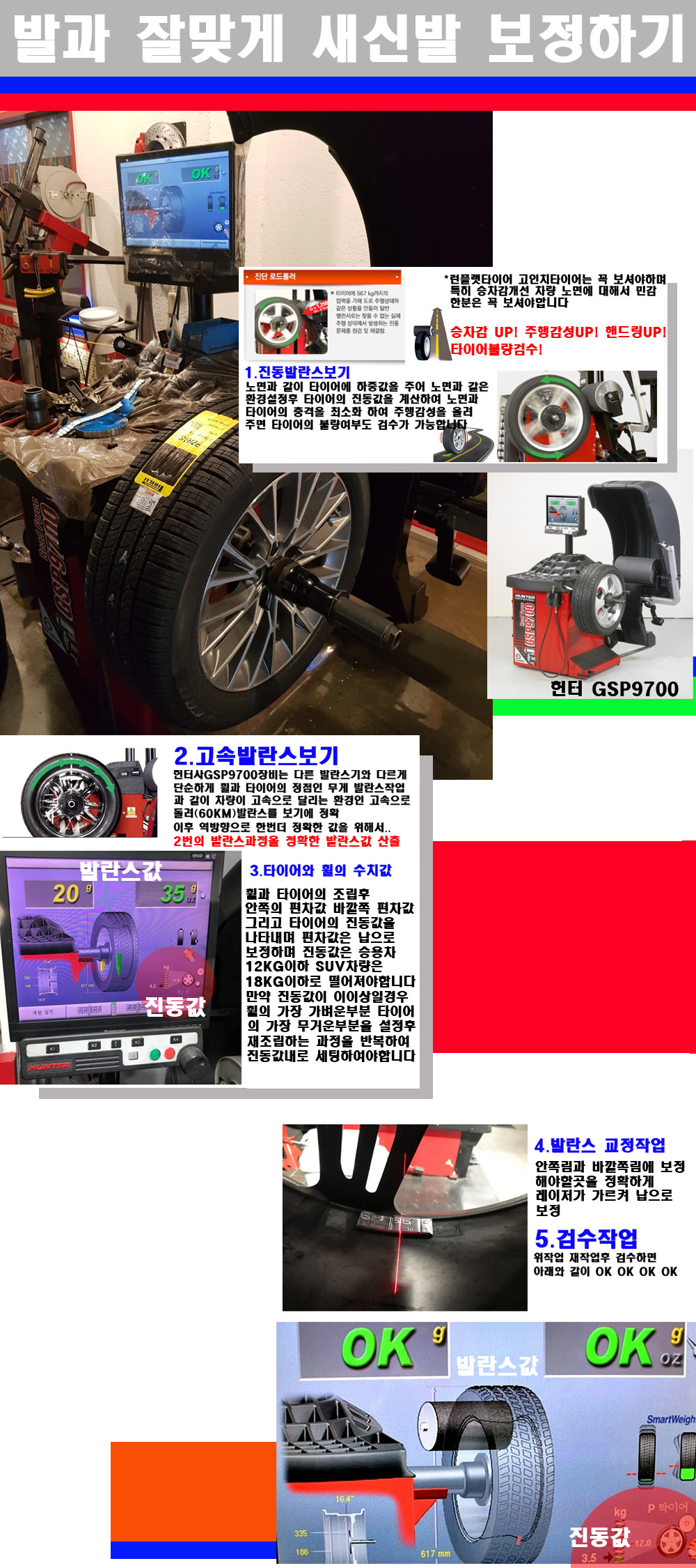 이후 미국 헌터사 GSP9700장비로 고속 및 진동발란스로 더욱더 작업의 정확도와 정밀도를 높였습니다 이장비는 노면에서 올라오는 진동값까지 계산하여 발란스값을 보는 방식으로 진동발란스기는 헌터사GSP9700장비가 유일합니다 이후 역방향으로 60키로의 고속으로 다시 발란스값을 보정하는 방식입니다 그래서 노면에서 올라오는 진동를 잡을수 있으며 특히 타이어의 노면력 측정으로 타이어의 불량여부까지도 검수가 가능한 장비입니다 특히 고속발란스 측정시 타사 발란스기와 틀리게 고속으로 발란스를 보기에 차량이 고속으로 달리는 시뮤레이션 구현이 가능하여 정확한 발란스값을 볼수가 있습니다 그리고 작업자에게는 불필요한 발란스납을 붙이지 않아 미관상으로 좋고 납을 절약하는 고객님에게도윈이고 작업자에게도 윈윈할수 있는 장비입니다 그리고 시중에서 고속진동발란스라고 말하시는 샵들이 많은데 꼭아셔야하는것은 고속발란스는 말그대로 발란스를 볼때 고속으로 돌리기에 60키로 전후 그리고 진동값을 계산하기위해서는 발란스기에 진동롤러가 있어야합니다 그래서 미국헌터사 GSP9700장비가 유일합니다