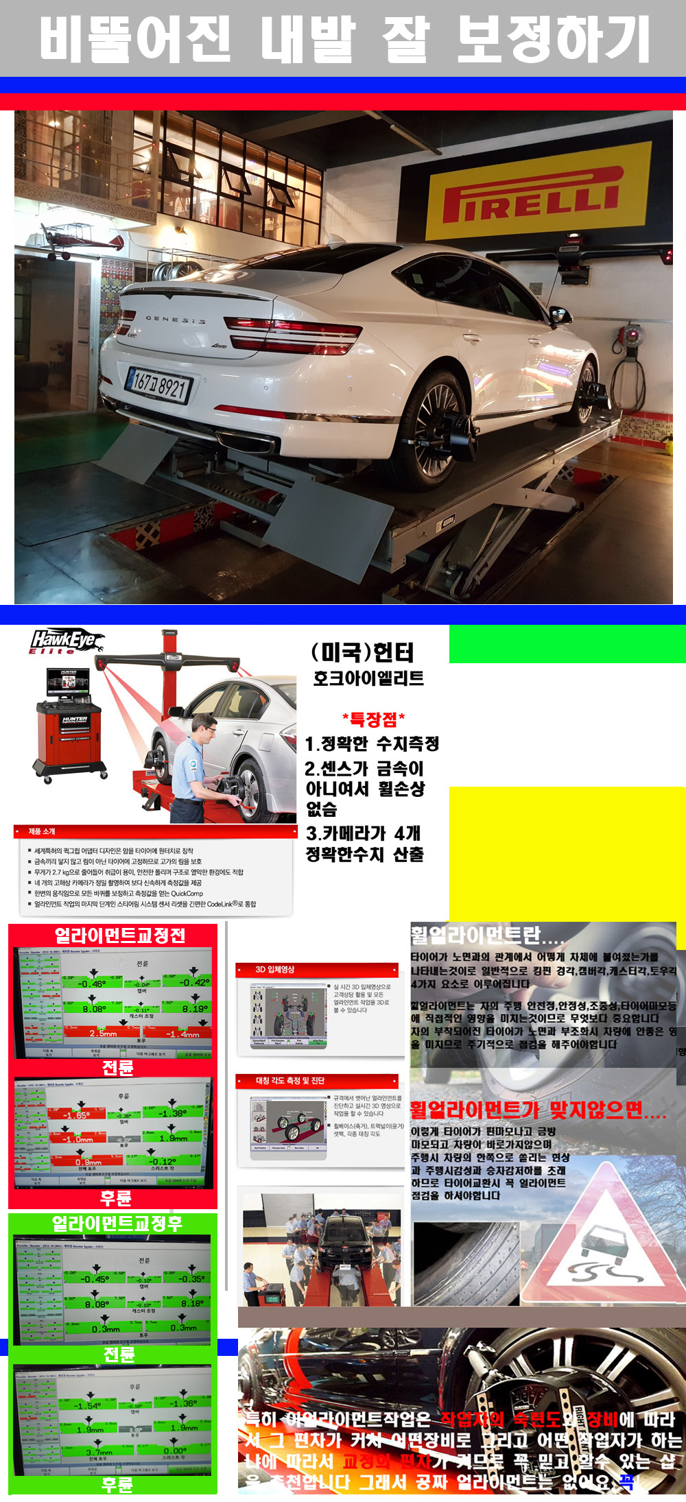 이후 미국 헌터사 호크아이엘리트 장비로 3D얼라이먼트를 진행했습니다 이장비는 현존하는 가장 진화된 얼라이먼트장비입니다 특히 4개의 고성능카메라가 장착되어져 있어 실시간으로 오차가 없는 측정값을 구현하며 바퀴당 각 휠센서 클램프가 프라스틱이며 타이어바닦면을 지지하는 방식이여서 휠의 손상이 없는것이 특징입니다 하지만 장비보다 차량의 얼라이먼트를 볼시 작업자의 정성과 그리고 능력과 숙련도가 관견이기에 꼭 휠얼라이먼트를 장사수단으로 하지않는 샵을 권장합니다 자사는 얼라이먼트정렬시 교정전 교정후를 구분하여 고객님께 직접 이수치값을 확인시켜드리고 작업을 하며 이후 각각의 특성을 가진 타이어들에 대해서 설명 및 관리요령 운전요령 같이 설명해드리고 있습니다 이후 타이어와 휠의 정확한 발란스값과 진동값을 보정후 헌터사 호크아이엘리트 3D얼라이먼트장비로 공장에서 처음 출고될시의 팩토리값으로 교정하였습니다 그리고 타이어질소가스주입기로 3번정도 진공상태로 만든후 질소가스를 주입했습니다 질소가스주입시 가장 관견은 순도이기에 이런 여러번의 진공상태후 주입하고 빼주는 과정를 많이 해주어야합니다 질소가스의 주입시 타이어공기압의 저하가 덜하고 화합물질이 반응을 하지않아 소음전파력과 그리고 타이어안쪽에 수분을 발생하지않으며 타이어안쪽에서의 공기압이 팽창하지않아 타이어에 스트레스를 덜주게 됩니다 하지만 이부분도 공기속에 질소가 80%정도 존재하기에 미미한 차이이지만 질소순도를 높이고 주행시 좋은 점이 확연히 많기에 질소주입을 해드리고 있습니다 특히 고성능타이어나 하중값을 많이 주는 타이어일경우에는 위에서 언급한 부분에서 많이 차이를 보이고 있습니다 이후 타이어왁싱후 출고했습니다+ 감사합니다 |