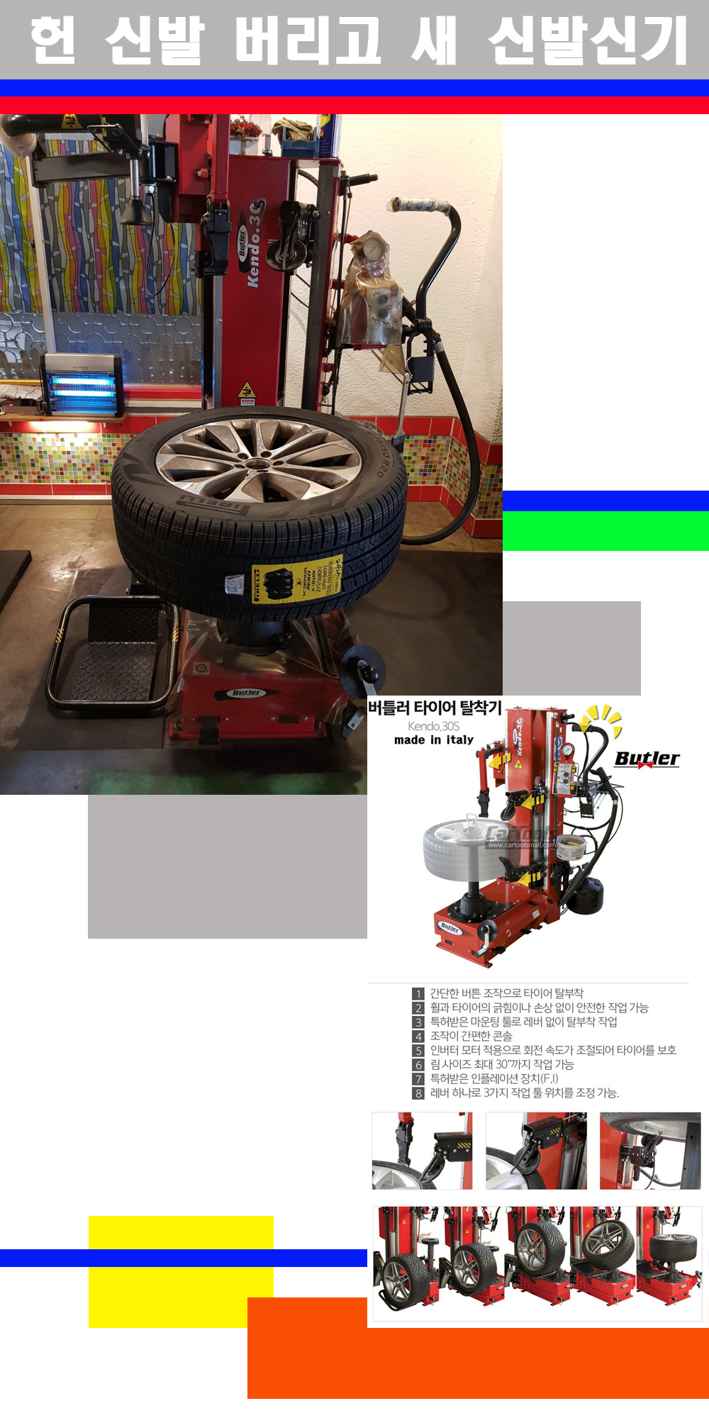 이태리 버틀러사의 켄도3.0S는 휠과 타이어와 조립과 분리시 전혀 제품에 손상을 주지않는 탈착기로 특히 센터락방식(중앙에서 휠를 고정하는 방식)이여서 휠의 중앙부위 잡아서 타이어를 탈부착하고 이후 상하롤러로 타이어를 탈부착합니다 특히 유니포미티작업(휠의 가장가벼운부분과 타이어의 가장 무거운부분을 매칭시키는 작업)시 작업자가 타이어를 정확한 지점에 휠과 매칭시킬수 있는 장점도 있습니다 유니포미티작업 불량시 과도한 진동값으로 핸들링불안 승차감저하 과도한 노면의 충격흡수를 가져와 주행감성을 해치는 첫번째 이유입니다 하지만 이런 작업을 무시하고 그냥 정적인 휠발란스작업만 하는것이 현실입니다 보통 타이어가격만 생각하시고 장착을 하시는데 꼭 이런 부분까지 챙길수 있는 샵을 권장합니다