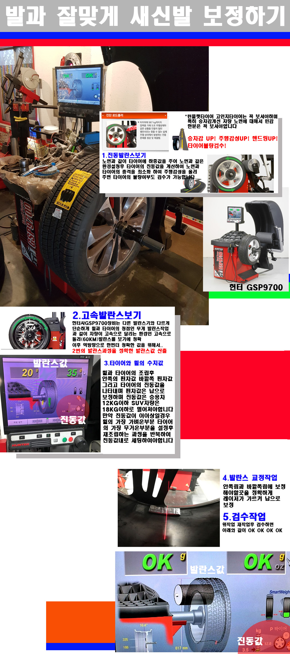 이후 미국 헌터사 GSP9700장비로 고속 및 진동발란스로 더욱더 작업의 정확도와 정밀도를 높였습니다 이장비는 노면에서 올라오는 진동값까지 계산하여 발란스값을 보는 방식으로 진동발란스기는 헌터사GSP9700장비가 유일합니다 이후 역방향으로 60키로의 고속으로 다시 발란스값을 보정하는 방식입니다 그래서 노면에서 올라오는 진동를 잡을수 있으며 특히 타이어의 노면력 측정으로 타이어의 불량여부까지도 검수가 가능한 장비입니다 특히 고속발란스 측정시 타사 발란스기와 틀리게 고속으로 발란스를 보기에 차량이 고속으로 달리는 시뮤레이션 구현이 가능하여 정확한 발란스값을 볼수가 있습니다 그리고 작업자에게는 불필요한 발란스납을 붙이지 않아 미관상으로 좋고 납을 절약하는 고객님에게도윈이고 작업자에게도 윈윈할수 있는 장비입니다 그리고 시중에서 고속진동발란스라고 말하시는 샵들이 많은데 꼭아셔야하는것은 고속발란스는 말그대로 발란스를 볼때 고속으로 돌리기에 60키로 전후 그리고 진동값을 계산하기위해서는 발란스기에 진동롤러가 있어야합니다 그래서 미국헌터사 GSP9700장비가 유일합니다