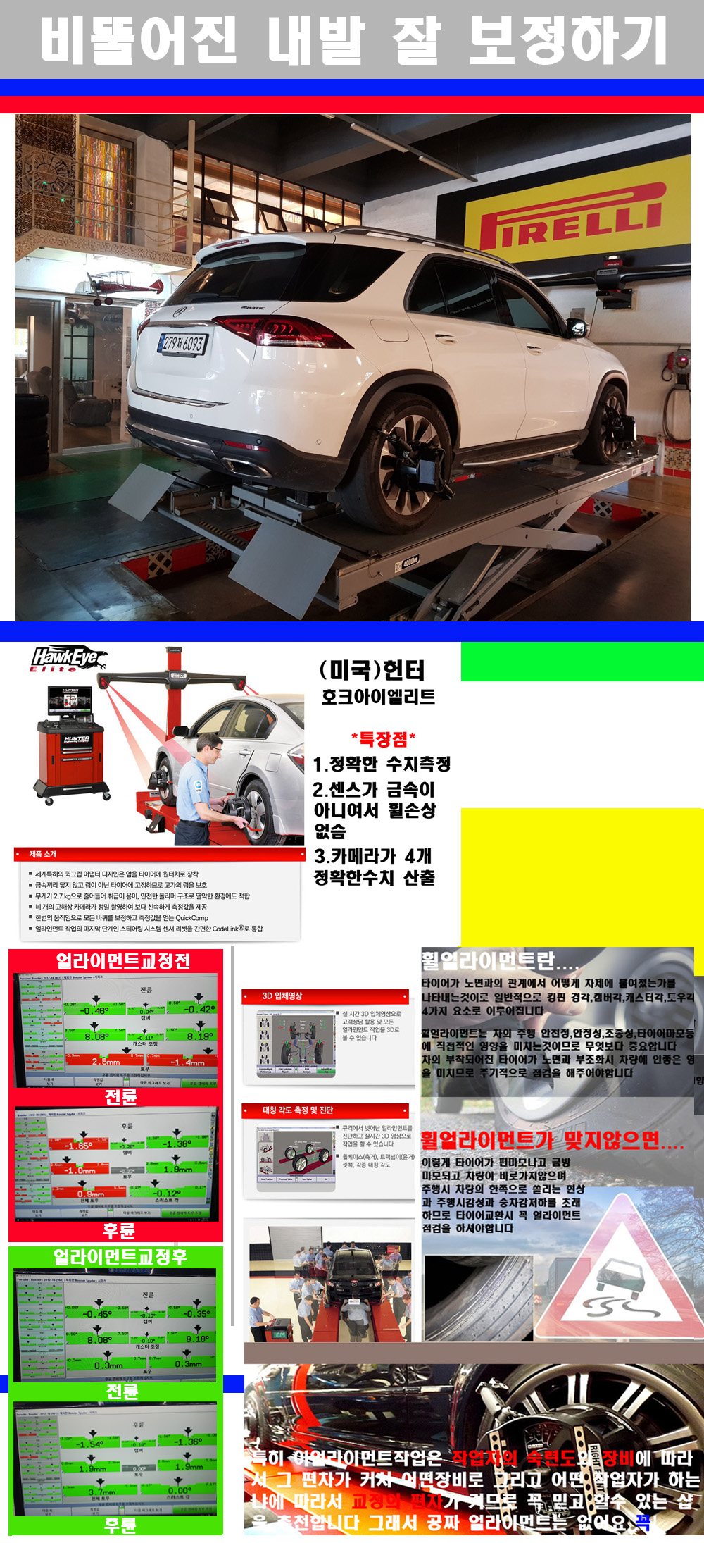 이후 미국 헌터사 호크아이엘리트 장비로 3D얼라이먼트를 진행했습니다 이장비는 현존하는 가장 진화된 얼라이먼트장비입니다 특히 4개의 고성능카메라가 장착되어져 있어 실시간으로 오차가 없는 측정값을 구현하며 바퀴당 각 휠센서 클램프가 프라스틱이며 타이어바닦면을 지지하는 방식이여서 휠의 손상이 없는것이 특징입니다 하지만 장비보다 차량의 얼라이먼트를 볼시 작업자의 정성과 그리고 능력과 숙련도가 관견이기에 꼭 휠얼라이먼트를 장사수단으로 하지않는 샵을 권장합니다 자사는 얼라이먼트정렬시 교정전 교정후를 구분하여 고객님께 직접 이수치값을 확인시켜드리고 작업을 하며 이후 각각의 특성을 가진 타이어들에 대해서 설명 및 관리요령 운전요령 같이 설명해드리고 있습니다 이후 타이어와 휠의 정확한 발란스값과 진동값을 보정후 헌터사 호크아이엘리트 3D얼라이먼트장비로 공장에서 처음 출고될시의 팩토리값으로 교정하였습니다 그리고 타이어질소가스주입기로 3번정도 진공상태로 만든후 질소가스를 주입했습니다 질소가스주입시 가장 관견은 순도이기에 이런 여러번의 진공상태후 주입하고 빼주는 과정를 많이 해주어야합니다 질소가스의 주입시 타이어공기압의 저하가 덜하고 화합물질이 반응을 하지않아 소음전파력과 그리고 타이어안쪽에 수분을 발생하지않으며 타이어안쪽에서의 공기압이 팽창하지않아 타이어에 스트레스를 덜주게 됩니다 하지만 이부분도 공기속에 질소가 80%정도 존재하기에 미미한 차이이지만 질소순도를 높이고 주행시 좋은 점이 확연히 많기에 질소주입을 해드리고 있습니다 특히 고성능타이어나 하중값을 많이 주는 타이어일경우에는 위에서 언급한 부분에서 많이 차이를 보이고 있습니다 이후 타이어왁싱후 출고했습니다+ 감사합니다 |