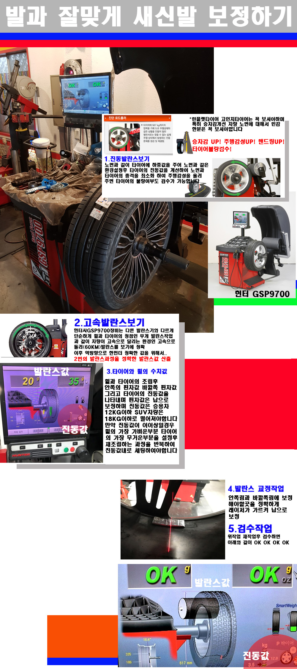 이후 미국 헌터사 GSP9700장비로 고속 및 진동발란스로 더욱더 작업의 정확도와 정밀도를 높였습니다 이장비는 노면에서 올라오는 진동값까지 계산하여 발란스값을 보는 방식으로 진동발란스기는 헌터사GSP9700장비가 유일합니다 이후 역방향으로 60키로의 고속으로 다시 발란스값을 보정하는 방식입니다 그래서 노면에서 올라오는 진동를 잡을수 있으며 특히 타이어의 노면력 측정으로 타이어의 불량여부까지도 검수가 가능한 장비입니다 특히 고속발란스 측정시 타사 발란스기와 틀리게 고속으로 발란스를 보기에 차량이 고속으로 달리는 시뮤레이션 구현이 가능하여 정확한 발란스값을 볼수가 있습니다 그리고 작업자에게는 불필요한 발란스납을 붙이지 않아 미관상으로 좋고 납을 절약하는 고객님에게도윈이고 작업자에게도 윈윈할수 있는 장비입니다 그리고 시중에서 고속진동발란스라고 말하시는 샵들이 많은데 꼭아셔야하는것은 고속발란스는 말그대로 발란스를 볼때 고속으로 돌리기에 60키로 전후 그리고 진동값을 계산하기위해서는 발란스기에 진동롤러가 있어야합니다 그래서 미국헌터사 GSP9700장비가 유일합니다