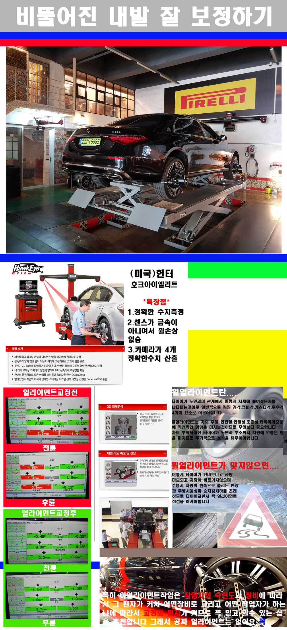 이후 미국 헌터사 호크아이엘리트 장비로 3D얼라이먼트를 진행했습니다 이장비는 현존하는 가장 진화된 얼라이먼트장비입니다 특히 4개의 고성능카메라가 장착되어져 있어 실시간으로 오차가 없는 측정값을 구현하며 바퀴당 각 휠센서 클램프가 프라스틱이며 타이어바닦면을 지지하는 방식이여서 휠의 손상이 없는것이 특징입니다 하지만 장비보다 차량의 얼라이먼트를 볼시 작업자의 정성과 그리고 능력과 숙련도가 관견이기에 꼭 휠얼라이먼트를 장사수단으로 하지않는 샵을 권장합니다 자사는 얼라이먼트정렬시 교정전 교정후를 구분하여 고객님께 직접 이수치값을 확인시켜드리고 작업을 하며 이후 각각의 특성을 가진 타이어들에 대해서 설명 및 관리요령 운전요령 같이 설명해드리고 있습니다 이후 타이어와 휠의 정확한 발란스값과 진동값을 보정후 헌터사 호크아이엘리트 3D얼라이먼트장비로 공장에서 처음 출고될시의 팩토리값으로 교정하였습니다 그리고 타이어질소가스주입기로 3번정도 진공상태로 만든후 질소가스를 주입했습니다 질소가스주입시 가장 관견은 순도이기에 이런 여러번의 진공상태후 주입하고 빼주는 과정를 많이 해주어야합니다 질소가스의 주입시 타이어공기압의 저하가 덜하고 화합물질이 반응을 하지않아 소음전파력과 그리고 타이어안쪽에 수분을 발생하지않으며 타이어안쪽에서의 공기압이 팽창하지않아 타이어에 스트레스를 덜주게 됩니다 하지만 이부분도 공기속에 질소가 80%정도 존재하기에 미미한 차이이지만 질소순도를 높이고 주행시 좋은 점이 확연히 많기에 질소주입을 해드리고 있습니다 특히 고성능타이어나 하중값을 많이 주는 타이어일경우에는 위에서 언급한 부분에서 많이 차이를 보이고 있습니다 이후 타이어왁싱후 출고했습니다+ 감사합니다 |